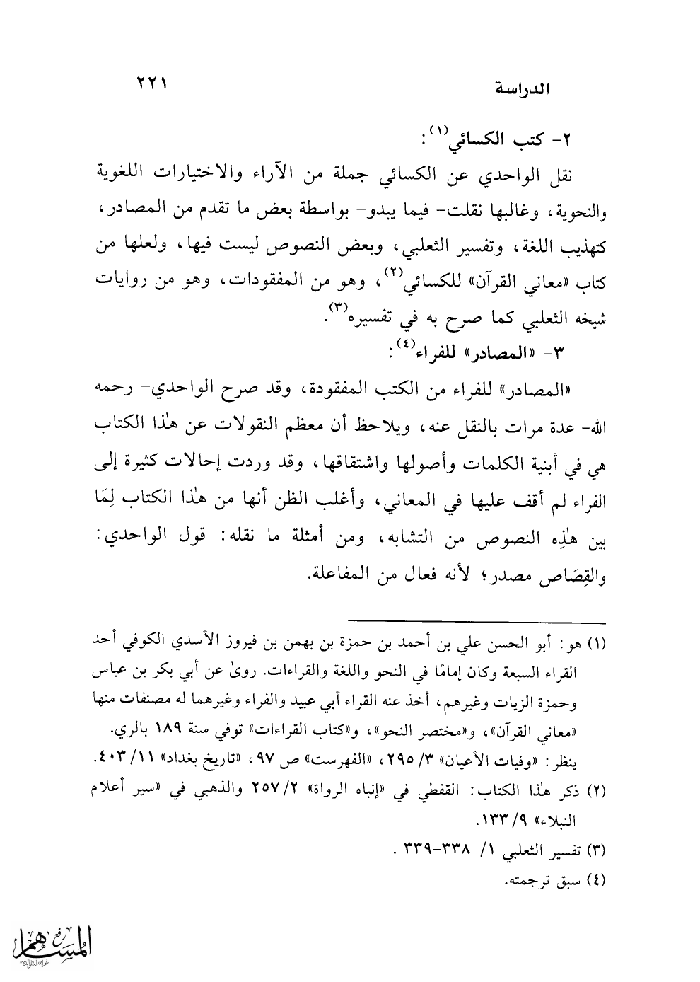 نقل الواحدي عن الكسائي جملة من الآراء والاختيارات اللغوية والنحوية، وغالبها نقلت -فيما يبدو- بواسطة بعض ما تقدم من المصادر، كتهذيب اللغة، وتفسير الثعلبي، وبعض النصوص ليست فيها، ولعلها من كثاب "معاني القرآن" للكسائي (¬2)، وهو من المفقودات، وهو من روايات شيخه الثعلبي كما صرح به في تفسيره (¬3).