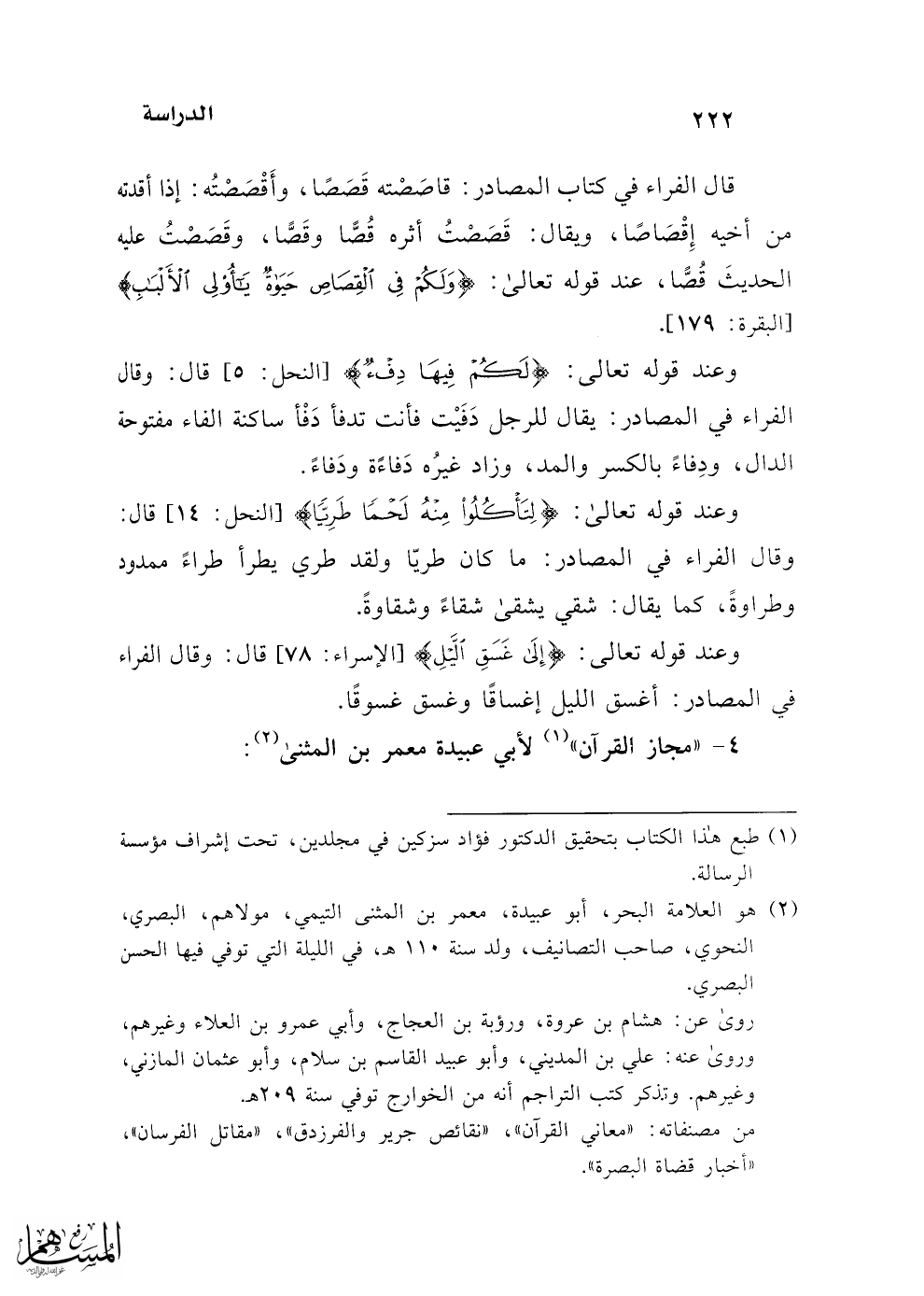 (¬1) طبع هذا الكتاب بتحقيق الدكتور فؤاد سزكين في مجلدين، تحت إشراف مؤسسة الرسالة.