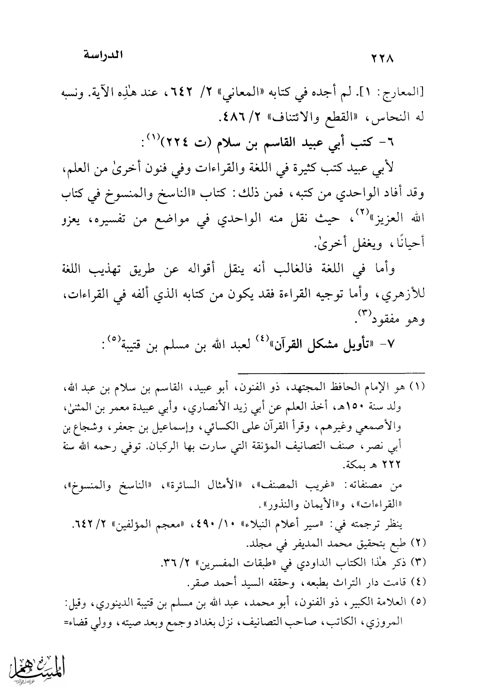 (¬1) هو الإمام الحافظ المجتهد، ذو الفنون، أبو عبيد، القاسم بن سلام بن عبد الله، ولد سنة 150هـ، أخذ العلم عن أبي زيد الأنصاري، وأبي عبيدة معمر بن المثنى، والأصمعي وغيرهم، وقرأ القرآن على الكسائي، وإسماعيل بن جعفر، وشجاع بن أبي نصر، صنف التصانيف المؤنقة التي سارت بها الركبان. توفي رحمه الله سنة 222 هـ بمكة.
