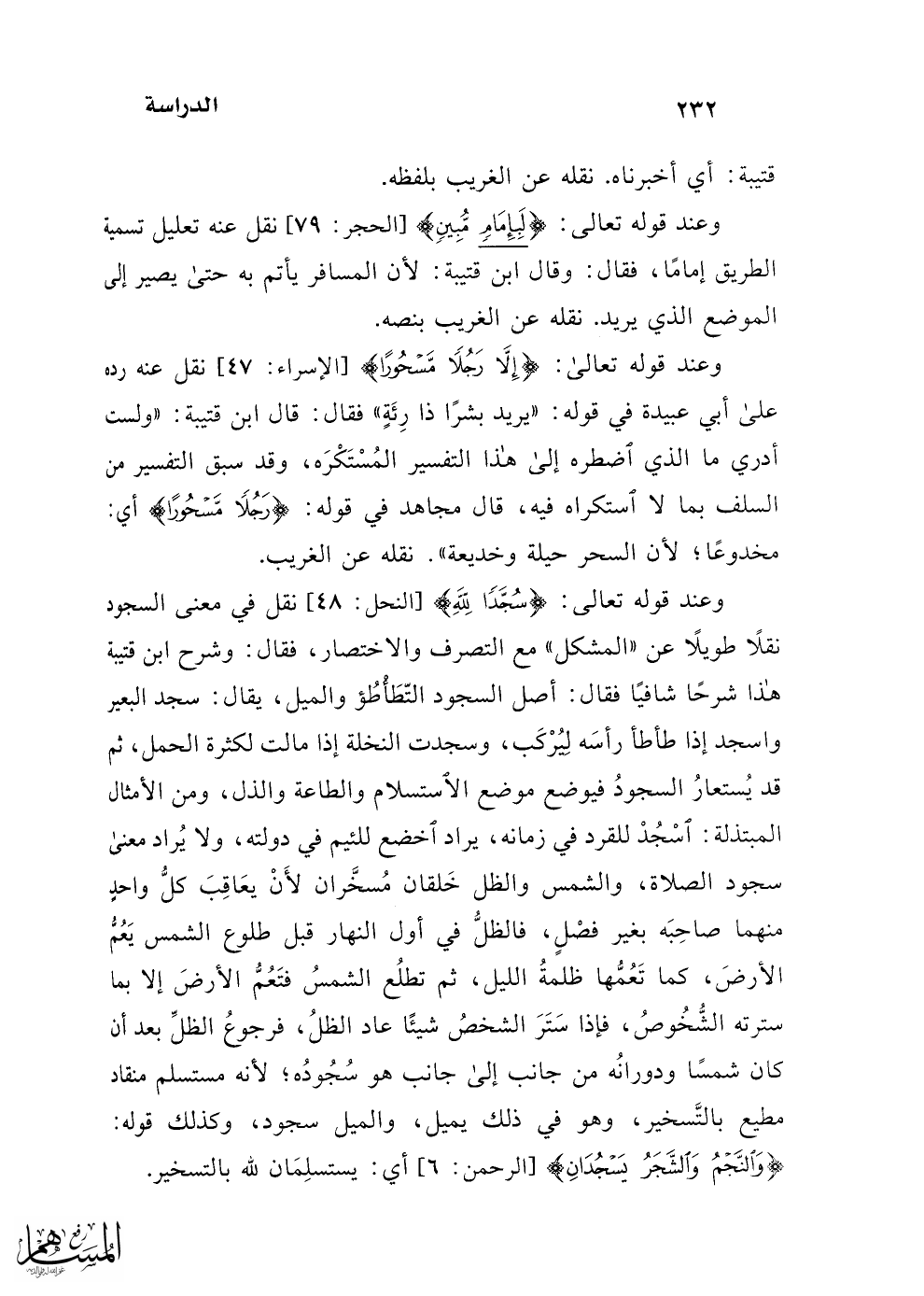 وعند قوله تعالى: {سُجَّدًا للهِ} [النحل: 48] نقل في معنى السجود نقلًا طويلًا عن "المشكل" مع التصرف والاختصار، فقال: وشرح ابن قتيبة هذا شرحًا شافيًا فقال: أصل السجود التّطَأْطُؤ والميل، يقال: سجد البعير واسجد إذا طأطأ رأسَه لِيُرْكَب، وسجد النخلة إذا مالت لكثرة الحمل، ثم قد يُستعارُ السجودُ فيوضع موضع الاستسلام والطاعة والذل، ومن الأمثال المبتذلة: اسْجُدْ للقرد في زمانه، يراد اخضع للئيم في دولته، ولا يُراد معنى سجود الصلاة، والشمس والظل خَلقان مُسخَّران لأَنْ يعَاقِبَ كلُّ واحدٍ منهما صاحِبَه بغير فصْلٍ، فالظلُّ في أول النهار قبل طلوع الشمس يَعُمُّ الأرضَ، كما تَعُمُّها ظلمةُ الليل، ثم تطلُع الشمسُ فتَعُمُّ الأرضَ إلى بما سترته الشُّخُوصُ، فإذا سَتَرَ الشخصُ شيئًا عاد الظلُ، فرجوعُ الظلِّ بعد أن كان شمسًا ودورانُه من جانب إلى جانب هو سُجُودُه؛ لأنه مستسلم منقاد مطيع بالتَّسخير، وهو في ذلك يميل، والميل سجود، وكذلك قوله: {وَالنَّجْمُ وَالشَّجَرُ يَسْجُدَانِ} [الرحمن: 6] أي: يستسلِمَان لله بالتسخير.