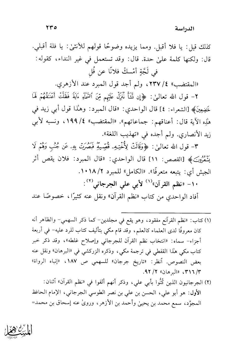 (¬1) كتاب: "نظم القرآن" مفقود، وهو يقع في مجلدين -كما ذكر السهمي- والظاهر أنه كان معروفًا لدى العلماء كالعلم، وقد قام مكي بتأليف كتاب للرد عليه -في أربعة أجزاء- سماه: "انتخاب نظم القرآن للجرجاني وإصلاح غلطه"، وقد ذكر خبر كتاب مكي هذا القفطي في ترجمة مكي، وذكره الزركشي في "البرهان" ونقل عنه بعض النصوص. انظر: "تاريخ جرجان" للسهمي ص 187، "إنباه الرواة" 3/ 316، "البرهان" 2/ 92.