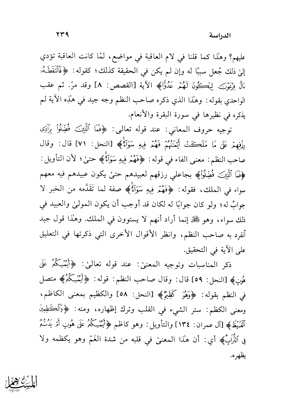 توجيه حروف المعاني: عند قوله تعالى: {فَمَا الَّذِينَ فُضِّلُوا بِرَادِّي رِزْقِهِمْ عَلَى مَا مَلَكَتْ أَيْمَانُهُمْ فَهُمْ فِيهِ سَوَاءٌ} [النحل: 71] قال: وقال صاحب النظم: معنى الفاء في قوله: {فَهُمْ فِيهِ سَوَاءٌ} حتى؛ لأن التأويل: {فَمَا الَّذِينَ فُضِّلُوا} بجاعلي رزقهم لعبيدهم حتى يكون عبيدهم فيه معهم سواء في الملك، فقوله: {فَمَا الَّذِينَ فُضِّلُوا} صفة لما تَقَدَّمه من الخبر لا جوابٌ له؛ ولو كان جوابًا له لكان قد أوجب أن يكون المولى والعبيد في ذلك سواء، وهو -عز وجل- إنما أراد أنهم لا يستوون في الملك. وهذا قول جيد انفرد به صاحب النظم، وانظر الأقوال الأخرى التي ذكرتها في التعليق على الآية في التحقيق.