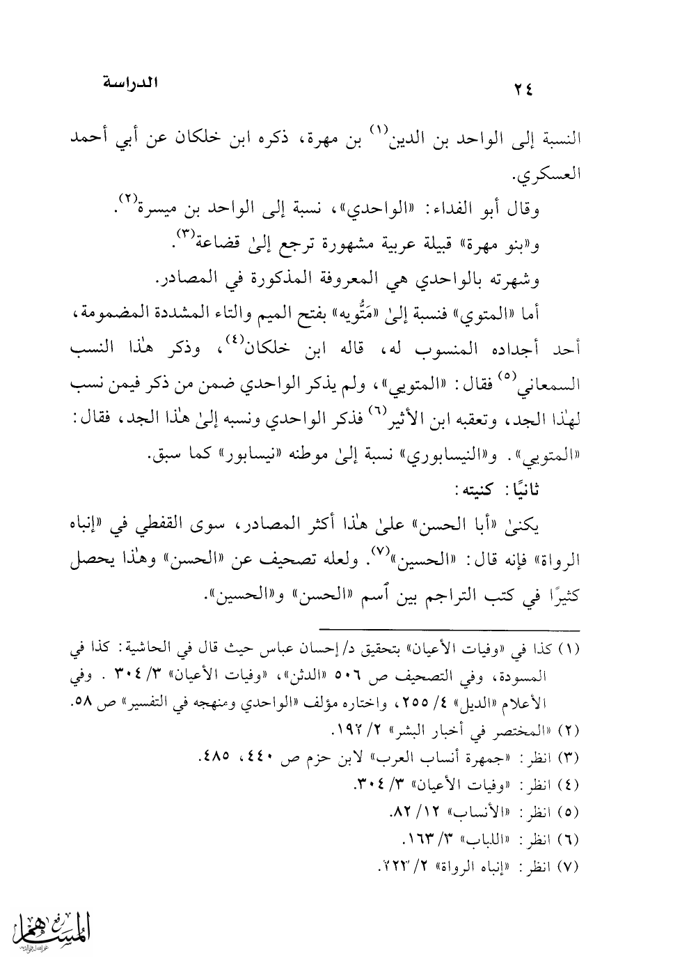 أما "المتوي" فنسبة إلى "مَتُّويه" بفتح الميم والتاء المشددة المضمومة، أحد أجداده المنسوب له، قاله ابن خلكان (¬4)، وذكر هذا النسب السمعاني (¬5) فقال: "المتويي"، ولم يذكر الواحدي ضمن من ذكر فيمن نسب لهذا الجد، وتعقبه ابن الأثير (¬6) فذكر الواحدي ونسبه إلى هذا الجد، فقال: "المتوبي". و"النيسابوري" نسبة إلى موطنه "نيسابور" كما سبق.
