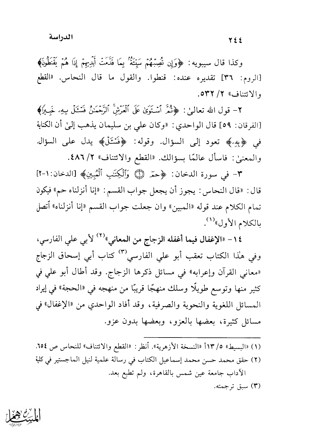 14 - " الإغفال فيما أغفله الزجاج من المعاني" (¬2) لأبي علي الفارسي، وفي هذا الكتاب تعقب أبو علي الفارسي (¬3) كتاب أبي إسحاق الزجاج "معاني القرآن وإعرابه" في مسائل ذكرها الزجاج. وقد أطال أبو علي في كثير منها وتوسع طويلًا وسلك منهجًا قريبًا من منهجه في "الحجة" في إيراد المسائل اللغوية والنحوية والصرفية، وقد أفاد الواحدي من "الإغفال" في مسائل كثيرة، بعضها بالعزو، وبعضها بدون عزو.