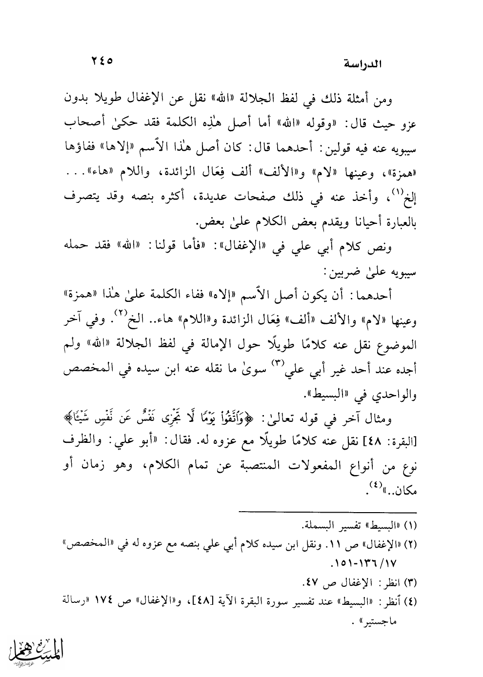 ونص كلام أبي علي في "الإغفال": "فأما قولنا: "الله" فقد حمله سيبويه على ضربين: