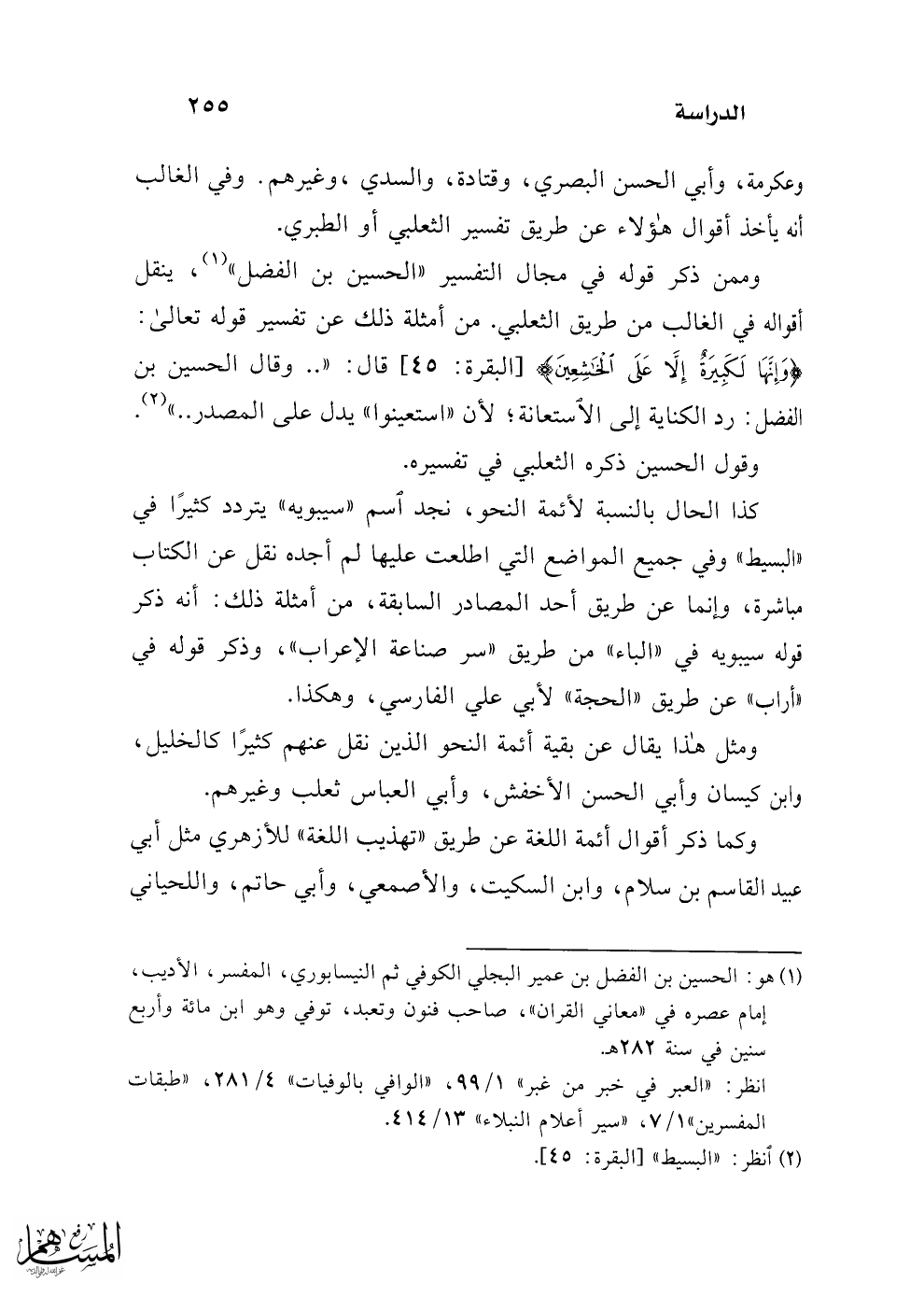 وممن ذكر قوله في مجال التفسير "الحسين بن الفضل" (¬1)، ينقل أقواله في الغالب من طريق الثعلبي. من أمثلة ذلك عن تفسير قوله تعالى: {وَإِنَّهَا لَكَبِيرَةٌ إِلَّا عَلَى الْخَاشِعِينَ} [البقرة: 45] قال: " .. وقال الحسين بن الفضل: رد الكناية إلى الاستعانة؛ لأن "استعينوا" يدل على المصدر .. " (¬2).