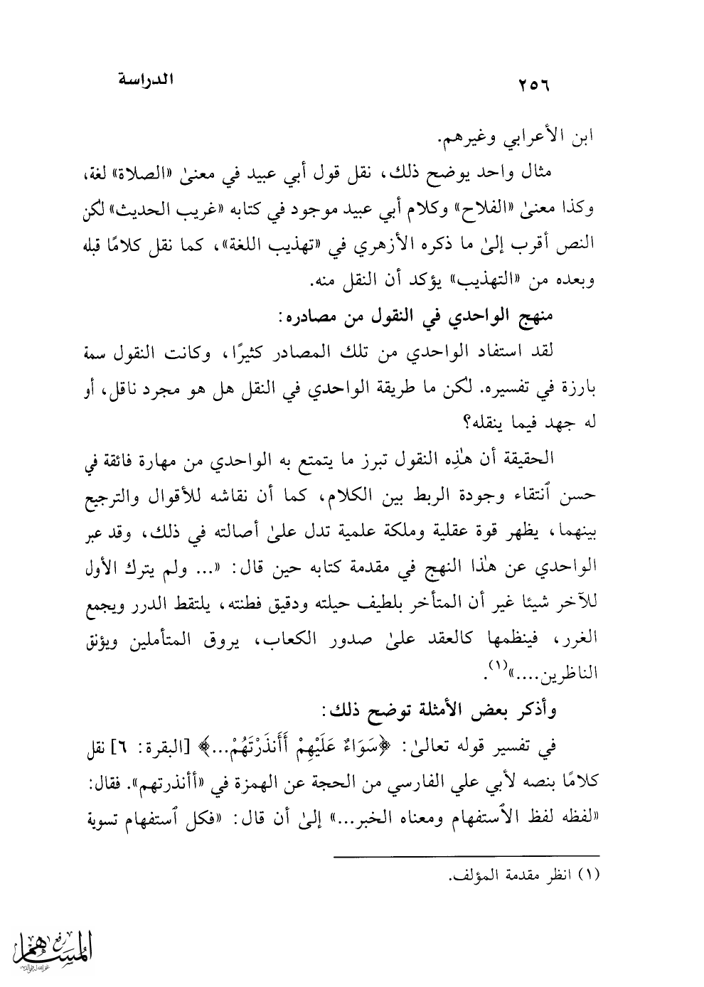 الحقيقة أن هذه النقول تبرز ما يتمتع به الواحدي من مهارة فائقة في حسن انتقاء وجودة الربط بين الكلام، كما أن نقاشه للأقوال والترجيح بينهما، يظهر قوة عقلية وملكة علمية تدل على أصالته في ذلك، وقد عبر الواحدي عن هذا النهج في مقدمة كتابه حين قال: " ... ولم يترك الأول للآخر شيئا غير أن المتأخر بلطيف حيلته ودقيق فطنته، يلتقط الدرر ويجمع الغرر، فينظمها كالعقد على صدور الكعاب، يروق المتأملين ويؤنق الناظرين .... " (¬1).