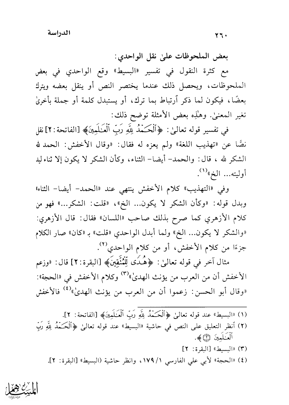 وفي "التهذيب" كلام الأخفش ينتهي عند "الحمد -أيضا- الثناء" وبدل قوله: "وكأن الشكر لا يكون ... الخ"، "قلت: الشكر ... " فهو من كلام الأزهري كما صرح بذلك صاحب "اللسان" فقال: قال الأزهري: "والشكر لا يكون ... الخ" ولما أبدل الواحدي "قلت" بـ"كان" صار الكلام جزءًا من كلام الأخفش، أو من كلام الواحدي (¬2).