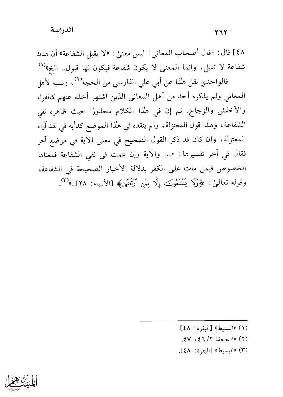 فالواحدي نقل هذا عن أبي علي الفارسي من الحجة (¬2)، ونسبه لأهل المعاني ولم يذكره أحد من أهل المعاني الذين اشتهر أخذه عنهم كالفراء والأخفش والزجاج. ثم إن في هذا الكلام محذورًا حيث ظاهره نفي الشفاعة، وهذا قول المعتزلة، ولم ينقده في هذا الموضع كدأبه في نقد آراء المعتزلة، وان كان قد ذكر القول الصحيح في معنى الآية في موضع آخر فقال في آخر تفسيرها: " ... والآية وإن عمت في نفي الشفاعة فمعناها الخصوص فيمن مات على الكفر بدلالة الأخبار الصحيحة في الشفاعة، وقوله تعالى: {وَلَا يَشْفَعُونَ إِلَّا لِمَنِ ارْتَضَى} [الأنبياء: 28] .. " (¬3).