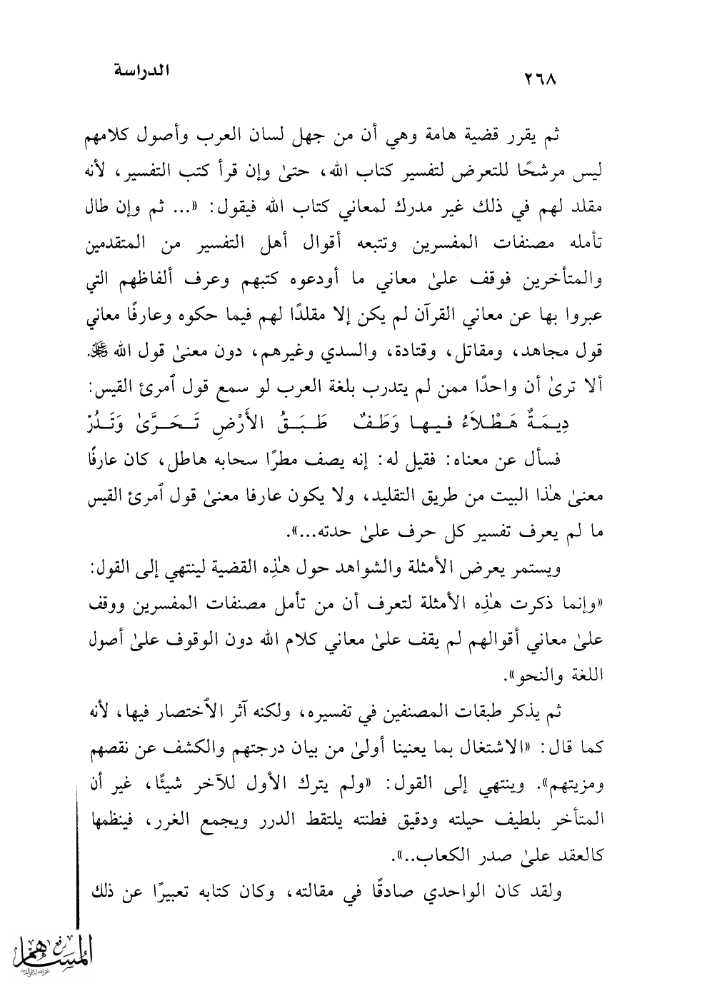 فسأل عن معناه: فقيل له: إنه يصف مطرًا سحابه هاطل، كان عارفًا معنى هذا البيت من طريق التقليد، ولا يكون عارفا معنى قول امرئ القيس ما لم يعرف تفسير كل حرف على حدته ... ".