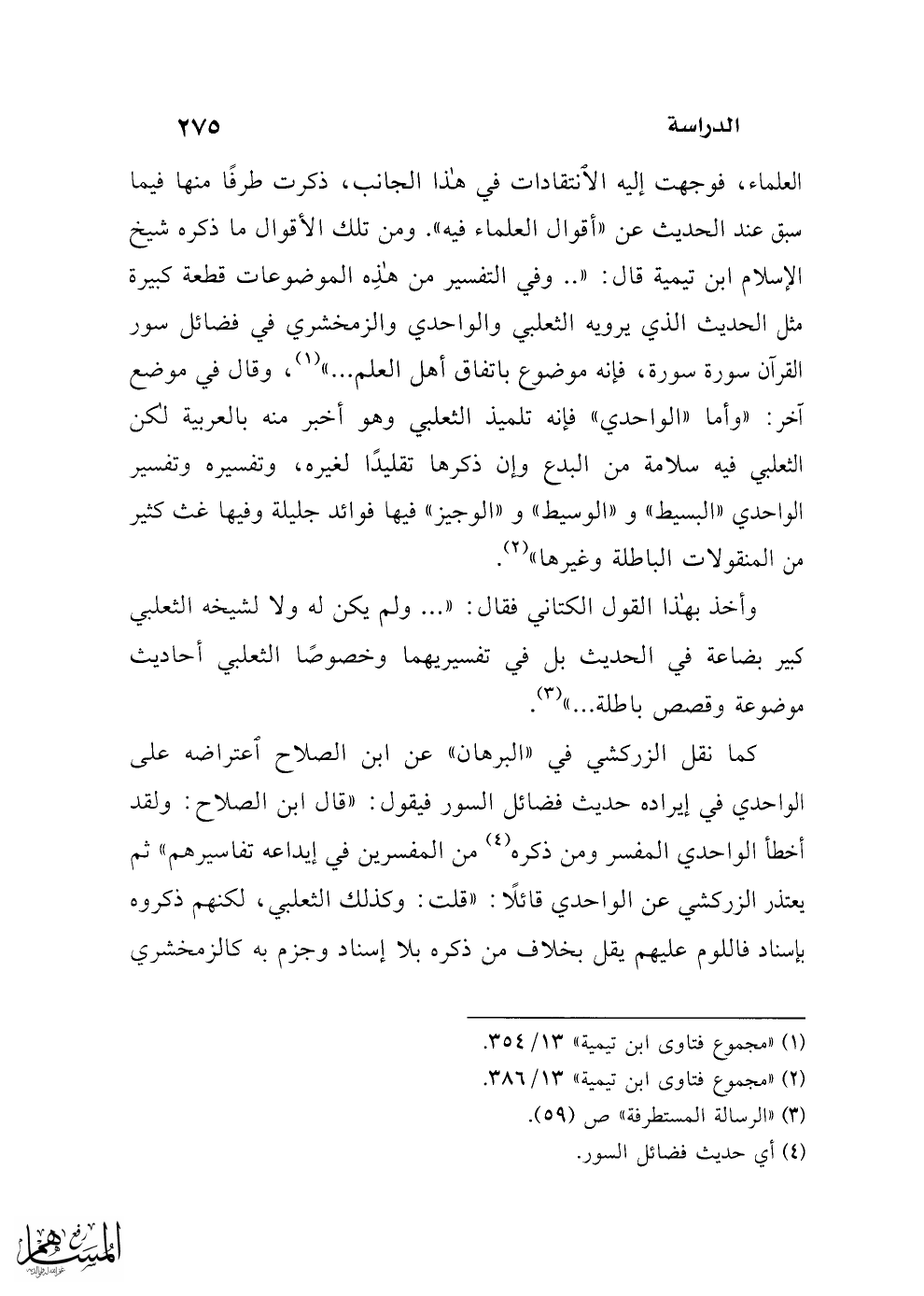 كما نقل الزركشي في "البرهان" عن ابن الصلاح اعتراضه على الواحدي في إيراده حديث فضائل السور فيقول: "قال ابن الصلاح: ولقد أخطأ الواحدي المفسر ومن ذكره (¬4) من المفسرين في إيداعه تفاسيرهم" ثم يعتذر الزركشي عن الواحدي قائلًا: "قلت: وكذلك الثعلبي، لكنهم ذكروه بإسناد فاللوم عليهم يقل بخلاف من ذكره بلا إسناد وجزم به كالزمخشري