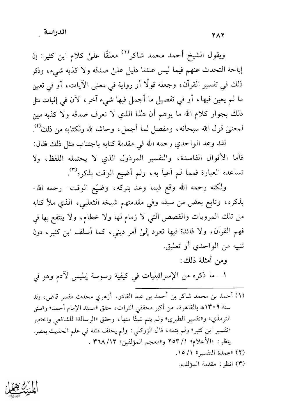 ويقول الشيخ أحمد محمد شاكر (¬1) معلقًا على كلام ابن كثير: إن إباحة التحدث عنهم فيما ليس عندنا دليل على صدقه ولا كذبه شيء، وذكر ذلك في تفسير القرآن، وجعله قولًا أو رواية في معنى الآيات، أو في تعيين ما لم يعين فيها، أو في تفصيل ما أجمل فيها شيء آخر، لأن في إثبات مثل ذلك بجوار كلام الله ما يوهم أن هذا الذي لا نعرف صدقه ولا كذبه مبين لمعنى قول الله سبحانه، ومفصل لما أجمل، وحاشا لله ولكتابه من ذلك (¬2).