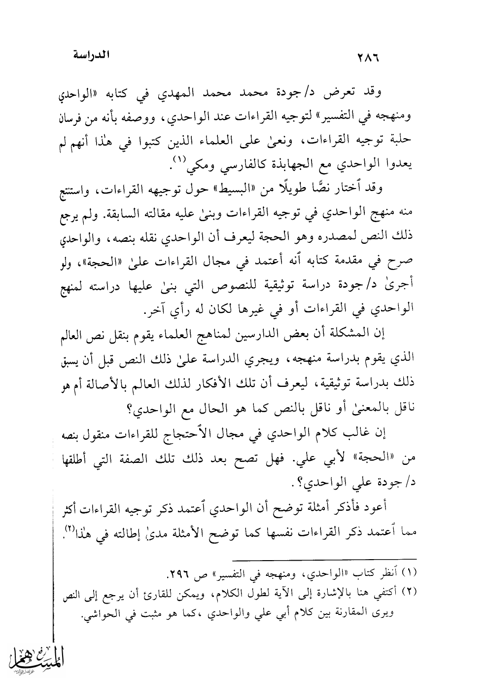 وقد اختار نصًّا طويلًا من "البسيط" حول توجيهه القراءات، واستنتج منه منهج الواحدي في توجيه القراءات وبنى عليه مقالته السابقة. ولم يرجع ذلك النص لمصدره وهو الحجة ليعرف أن الواحدي نقله بنصه، والواحدي صرح في مقدمة كتابه انه أعتمد في مجال القراءات على "الحجة"، ولو أجرى د/ جودة دراسة توثيقية للنصوص التي بنا عليها دراسته لمنهج الواحدي في القراءات أو في غيرها لكان له رأي آخر.