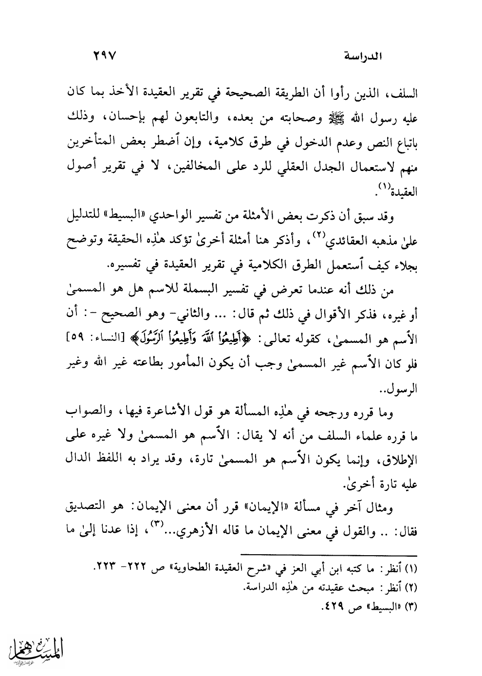 وقد سبق أن ذكرت بعض الأمثلة من تفسير الواحدي "البسيط" للتدليل على مذهبه العقائدي (¬2)، وأذكر هنا أمثلة أخرى تؤكد هذِه الحقيقة وتوضح بجلاء كيف استعمل الطرق الكلامية في تقرير العقيدة في تفسيره.