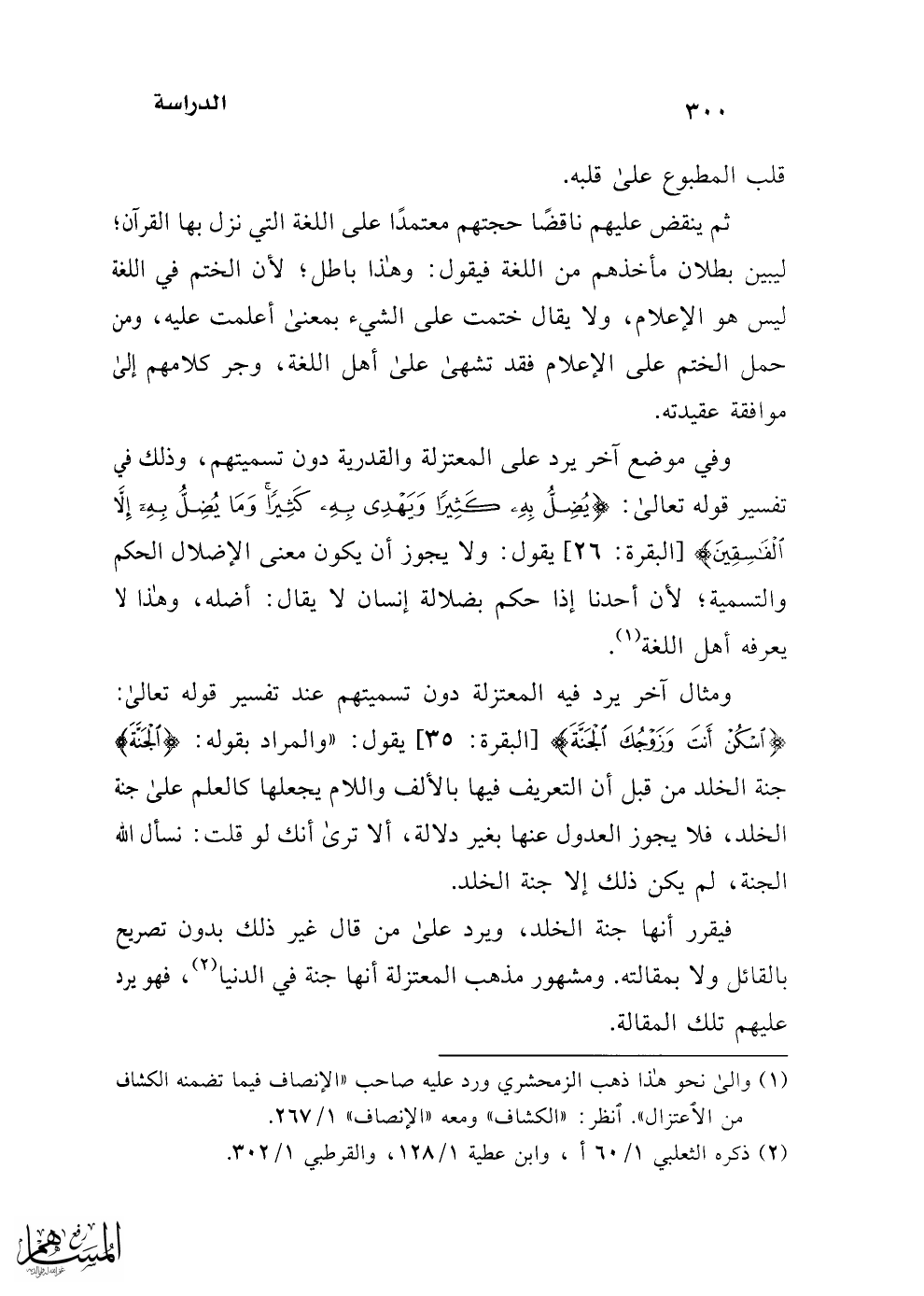 ومثال آخر يرد فيه المعتزلة دون تسميتهم عند تفسير قوله تعالى: {اسْكُنْ أَنْتَ وَزَوْجُكَ الْجَنَّةَ} [البقرة: 35] يقول: "والمراد بقوله: {الْجَنَّةَ} جنة الخلد من قبل أن التعريف فيها بالألف واللام يجعلها كالعلم على جنة الخلد، فلا يجوز العدول عنها بغير دلالة، ألا ترى أنك لو قلت: نسأل الله الجنة، لم يكن ذلك إلى جنة الخلد.