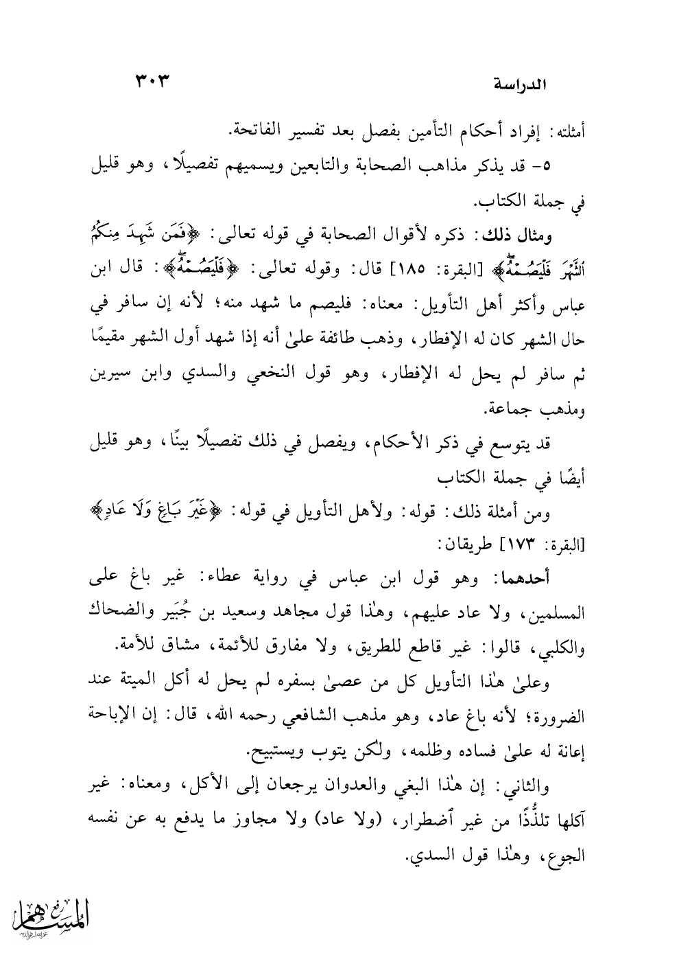 ومن أمثلة ذلك: قوله: ولأهل التأويل في قوله: {غَيْرَ بَاغٍ وَلَا عَادٍ} [البقرة: 173] طريقان: