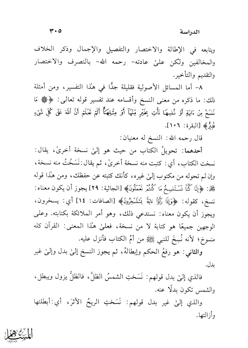 8 - أما المسائل الأصولية فقليلة جدًّا في هذا التفسير، ومن أمثلة ذلك: ما ذكره من معنى النسخ وأقسامه عند تفسير قوله تعالى: {مَا نَنْسَخْ مِنْ آيَةٍ أَوْ نُنْسِهَا نَأْتِ بِخَيْرٍ مِنْهَا أَوْ مِثْلِهَا أَلَمْ تَعْلَمْ أَنَّ اللَّهَ عَلَى كُلِّ شَيْءٍ قَدِيرٌ} [البقرة: 106].