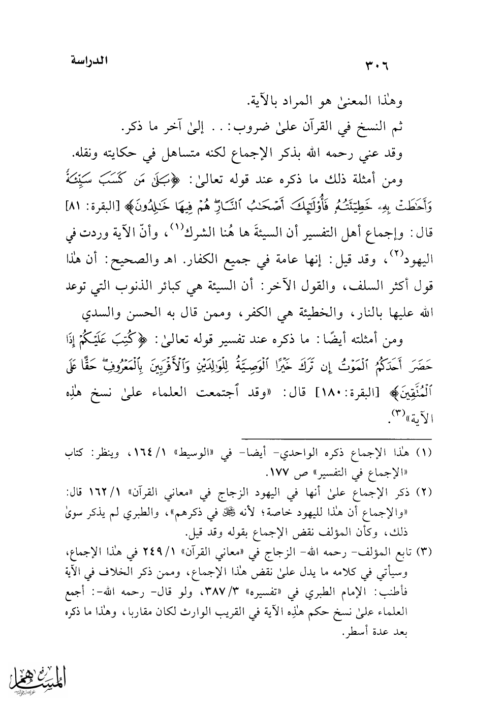 (¬3) تابع المؤلف -رحمه الله- الزجاج في "معاني القرآن" 1/ 249 في هذا الإجماع، وسيأتي في كلامه ما يدل على نقض هذا الإجماع، وممن ذكر الخلاف في الآية فأطنب: الإمام الطبري في "تفسيره" 3/ 387، ولو قال -رحمه الله-: أجمع العلماء على نسخ حكم هذه الآية في القريب الوارث لكان مقاربا، وهذا ما ذكره بعد عدة أسطر.