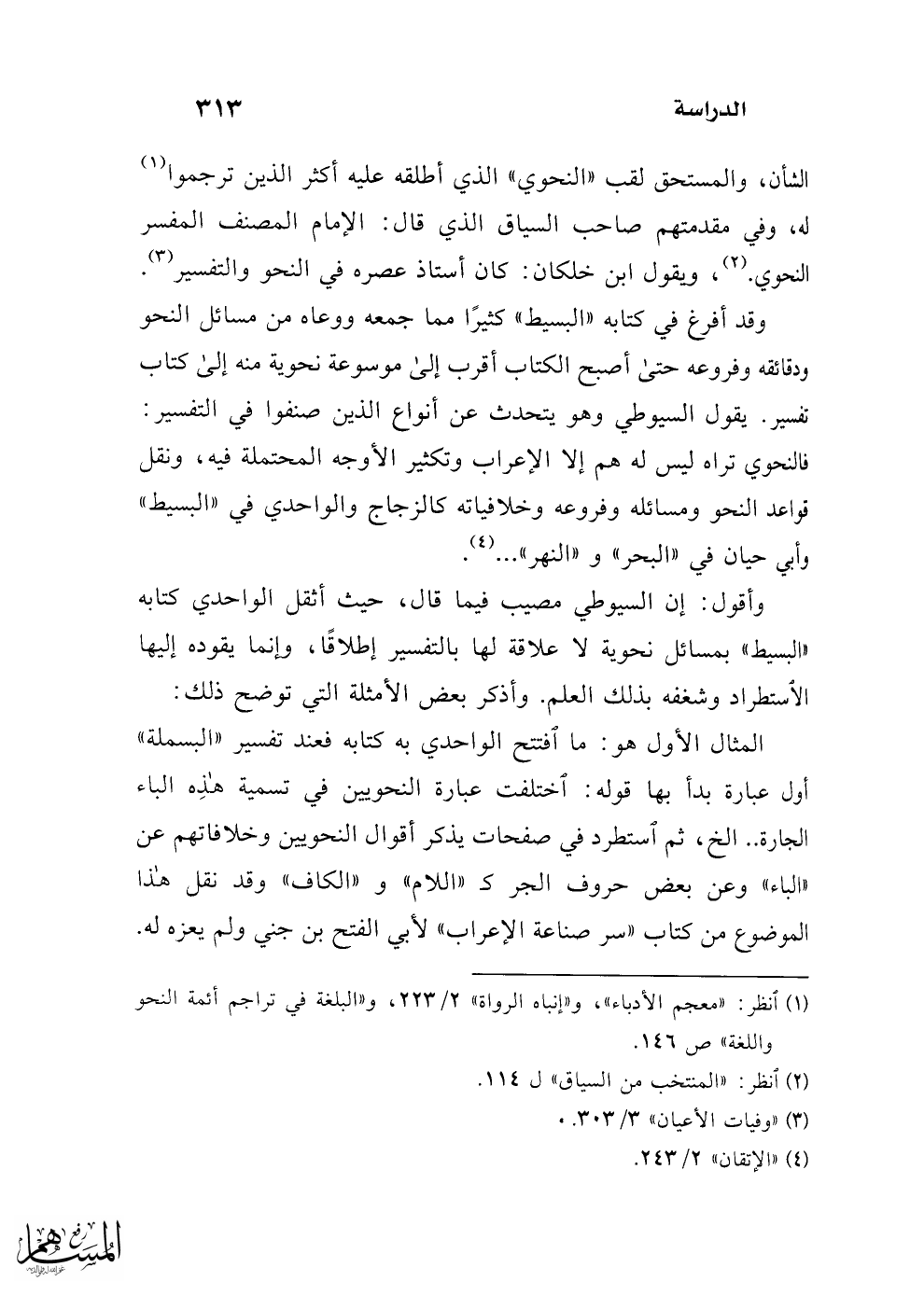 وقد أفرغ في كتابه "البسيط" كثيرًا مما جمعه ووعاه من مسائل النحو ودقائقه وفروعه حتى أصبح الكتاب أقرب إلى موسوعة نحوية منه إلى كتاب تفسير. يقول السيوطي وهو يتحدث عن أنواع الذين صنفوا في التفسير: فالنحوي تراه ليس له هم إلا الإعراب وتكثير الأوجه المحتملة فيه، ونقل فواعد النحو ومسائله وفروعه وخلافياته كالزجاج والواحدي في "البسيط" وأبي حيان في "البحر" و"النهر" ... (¬4).