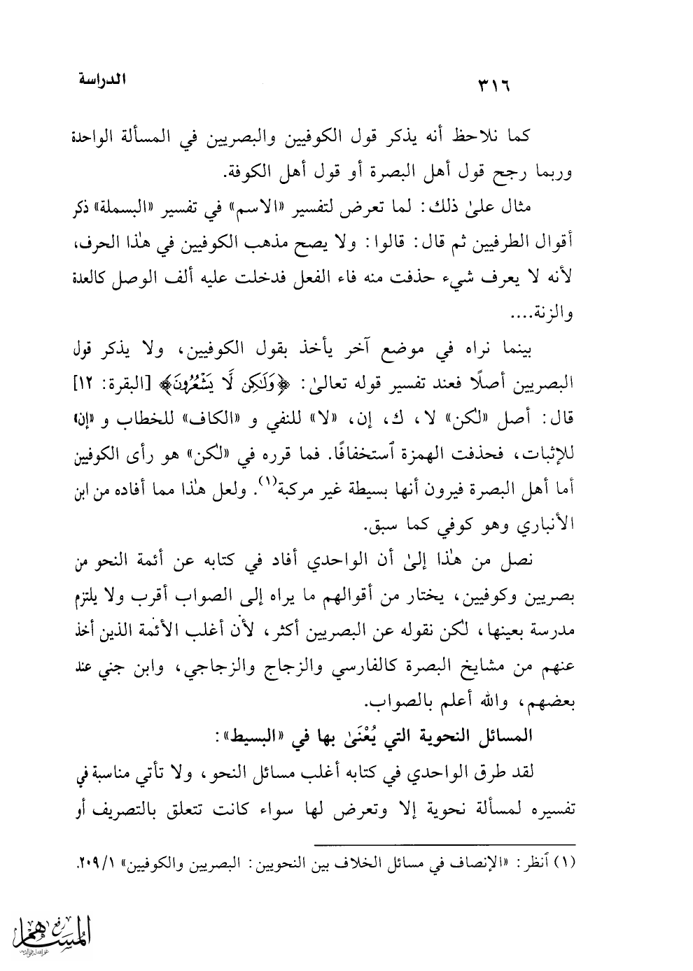 نصل من هذا إلى أن الواحدي أفاد في كتابه عن أئمة النحو من بصريين وكوفيين، يختار من أقوالهم ما يراه إلى الصواب أقرب ولا يلتزم مدرسة بعينها، لكن نقوله عن البصريين أكثر، لأن أغلب الأئمة الذين أخذ عنهم من مشايخ البصرة كالفارسي والزجاج والزجاجي، وابن جني عند بعضهم، والله أعلم بالصواب.