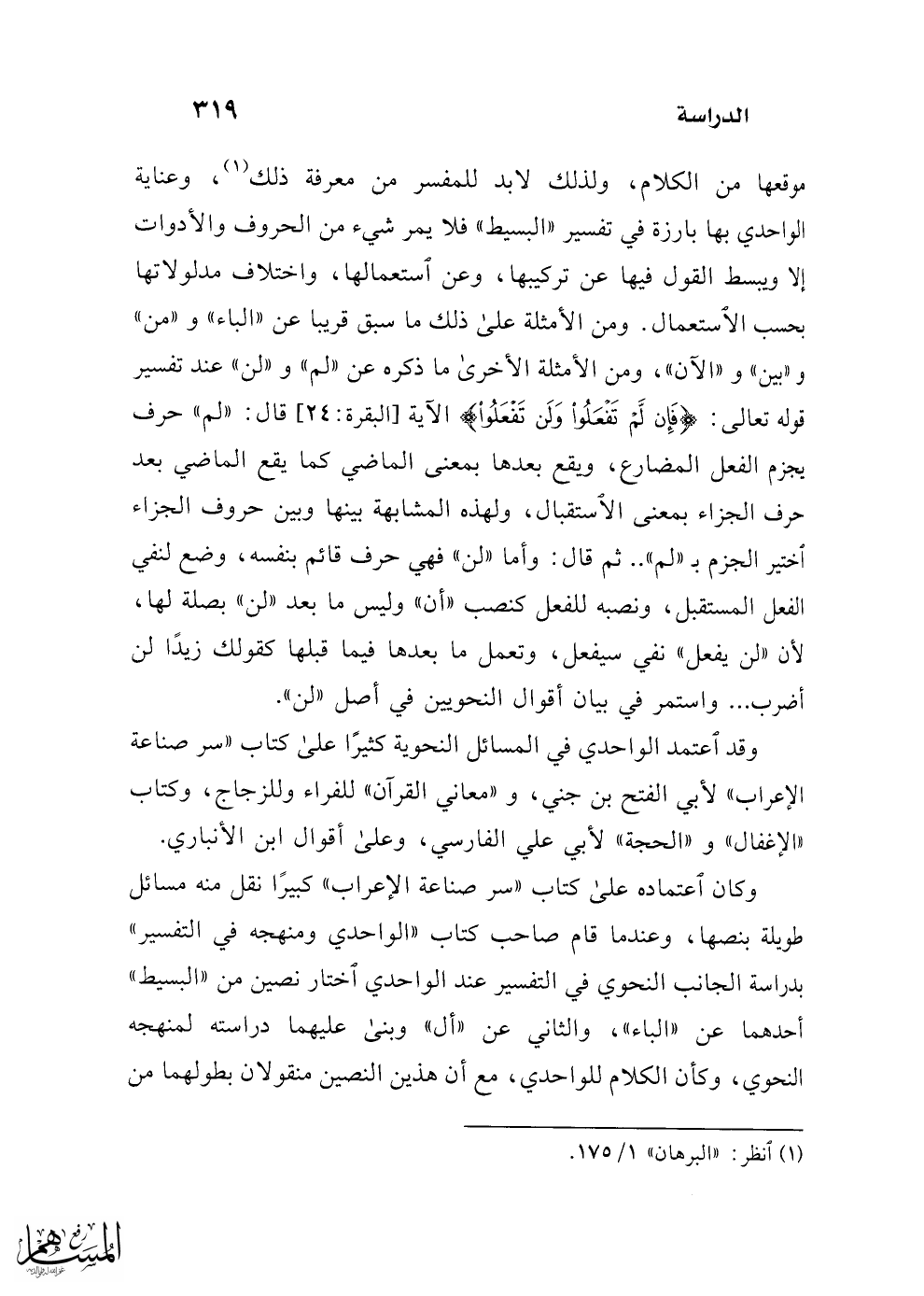 موقعها من الكلام، ولذلك لابد للمفسر من معرفة ذلك (¬1)، وعناية الواحدي بها بارزة في تفسير "البسيط" فلا يمر شيء من الحروف والأدوات إلا ويبسط القول فيها عن تركيبها، وعن استعمالها، واختلاف مدلولاتها بحسب الاستعمال. ومن الأمثلة على ذلك ما سبق قريبا عن "الباء" و"من" و"بين" و"الآن"، ومن الأمثلة الأخرى ما ذكره عن "لم" و"لن" عند تفسير قوله تعالى: {فَإِنْ لَمْ تَفْعَلُوا وَلَنْ تَفْعَلُوا} [البقرة: 24] قال: "لم" حرف يجزم الفعل المضارع، ويقع بعدها بمعنى الماضي كما يقع الماضي بعد حرف الجزاء بمعنى الاستقبال، ولهذه المشابهة بينها وبين حروف الجزاء اختير الجزم بـ"لم" .. ثم قال: وأما "لن" فهي حرف قائم بنفسه، وضع لنفي الفعل المستقبل، ونصبه للفعل كنصب "أن" وليس ما بعد "لن" بصلة لها، لأن "لن يفعل" نفي سيفعل، وتعمل ما بعدها فيما قبلها كقولك زيدًا لن أضرب ... واستمر في بيان أقوال النحويين في أصل "لن".