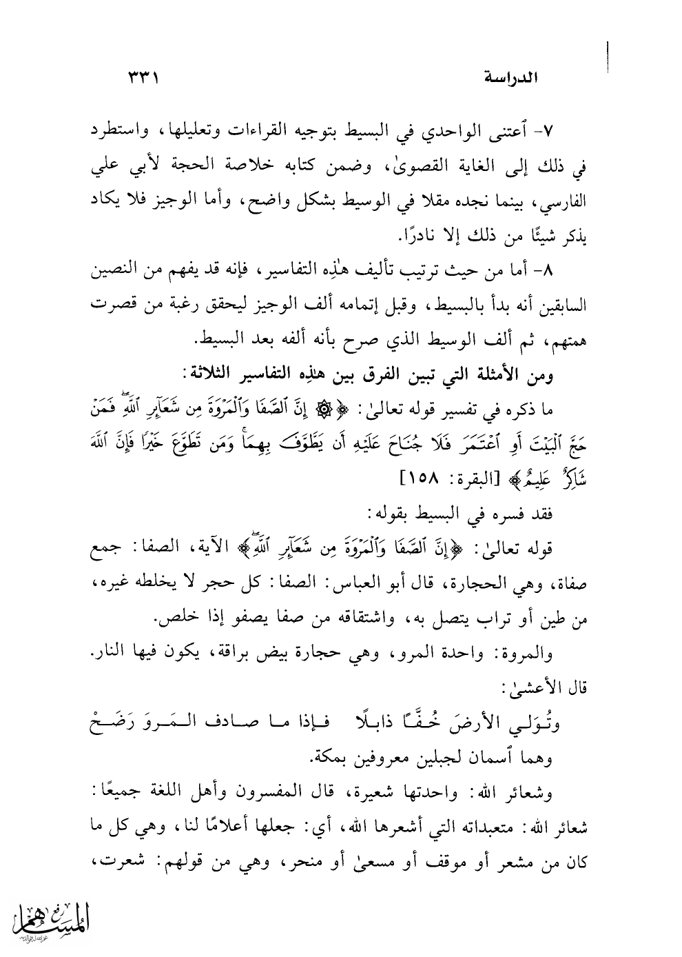 7 - اعتنى الواحدي في البسيط بتوجيه القراءات وتعليلها، واستطرد في ذلك إلى الغاية القصوى، وضمن كتابه خلاصة الحجة لأبي علي الفارسي، بينما نجده مقلا في الوسيط بشكل واضح، وأما الوجيز فلا يكاد يذكر شيئًا من ذلك إلا نادرًا.