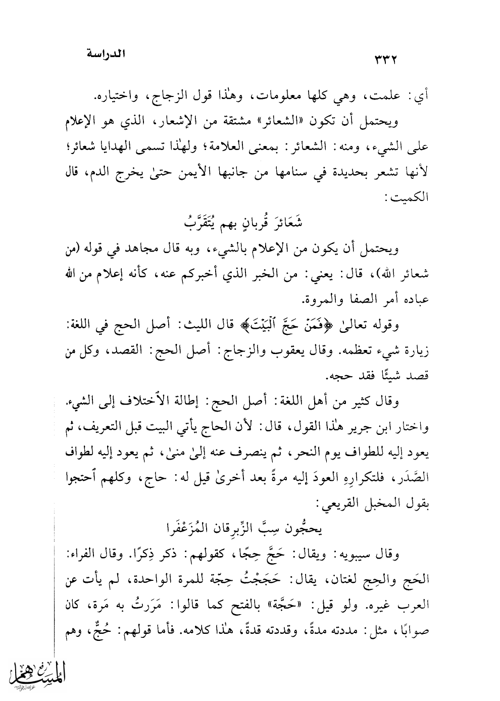 وقال كثير من أهل اللغة: أصل الحج: إطالة الاختلاف إلى الشيء. واختار ابن جرير هذا القول، قال: لأن الحاج يأتي البيت قبل التعريف، ثم يعود إليه للطواف يوم النحر، ثم ينصرف عنه إلى منى، ثم يعود إليه لطواف الصَّدَر، فلتكرارِهِ العودَ إليه مرةً بعد أخرى قيل له: حاج، وكلهم احتجوا بقول المخبل القريعي: