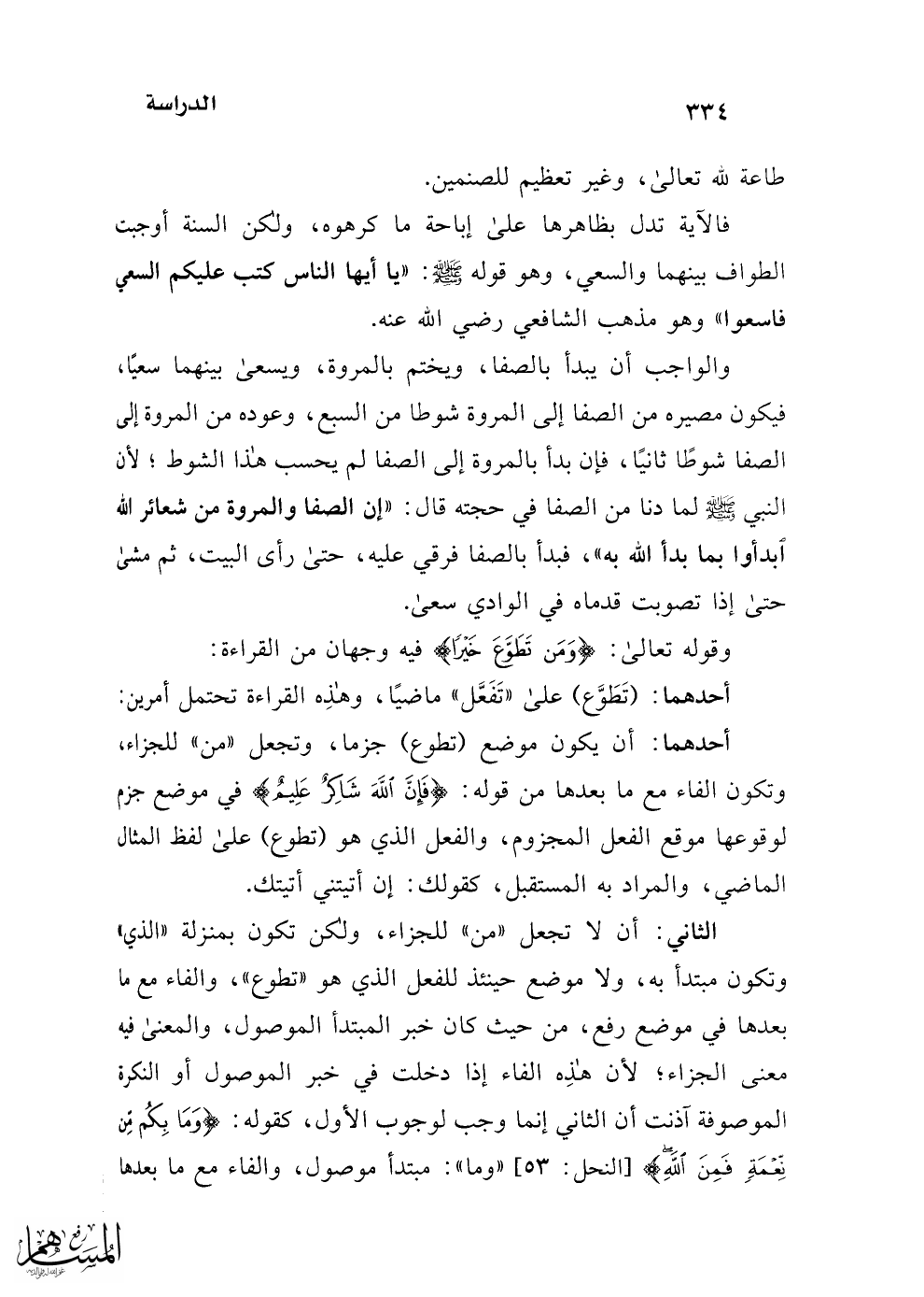 فالآية تدل بظاهرها على إباحة ما كرهوه، ولكن السنة أوجبت الطواف بينهما والسعي، وهو قوله -صلى الله عليه وسلم-: "يا أيها الناس كتب عليكم السعي فاسعوا" وهو مذهب الشافعي رضي الله عنه.