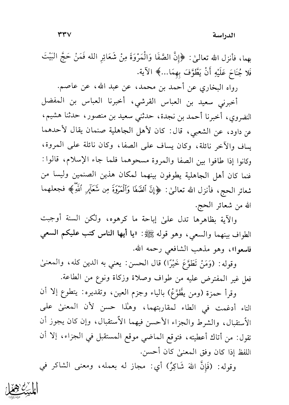 أخبرني سعيد بن العباس القرشي، أخبرنا العباس بن المفضل النضروي، أخبرنا أحمد بن نجدة، حدثني سعيد بن منصور، حدثنا هشيم، عن داود، عن الشعبي، قال: كان لأهل الجاهلية صنمان يقال لأحدهما يساف والآخر نائلة، وكان يساف على الصفا، وكان نائلة على المروة، وكانوا إذا طافوا بين الصفا والمروة مسحوهما فلما جاء الإسلام، قالوا: غنما كان أهل الجاهلية يطوفون بينهما لمكان هذين الصنمين وليسا من شعائر الحج، فأنزل الله تعالى: {إِنَّ الصَّفَا وَالْمَرْوَةَ مِنْ شَعَائِرِ اللَّهِ} فجعلهما الله من شعائر الحج.
