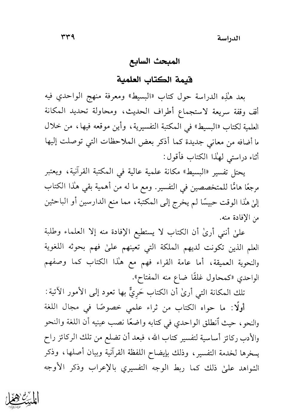 بعد هذه الدراسة حول كتاب "البسيط" ومعرفة منهج الواحدي فيه أقف وقفة سريعة لاستجماع أطراف الحديث، ومحاولة تحديد المكانة العلمية لكتاب "البسيط" في المكتبة التفسيرية، وأين موقعه فيها، من خلال ما أضافه من معاني جديدة كما أذكر بعض الملاحظات التي توصلت إليها أئناء دراستي لهذا الكتاب فأقول:
