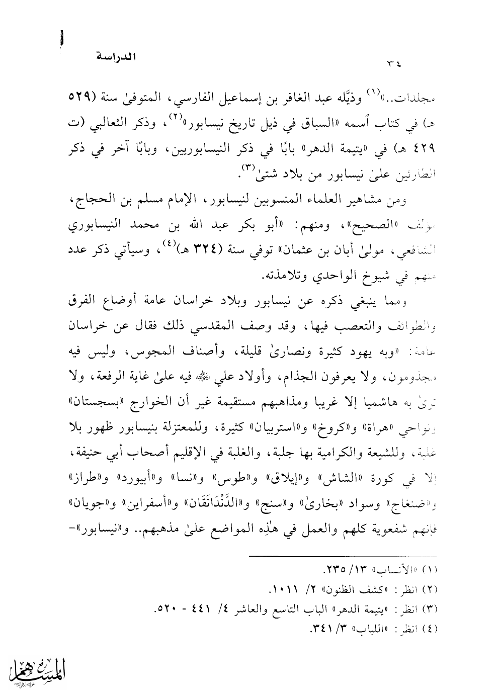 مجلدات .. " (¬1) وذيَّله عبد الغافر بن إسماعيل الفارسي، المتوفى سنة (529 هـ) في كتاب اسمه "السباق في ذيل تاريخ نيسابور" (¬2)، وذكر الثعالبي (ت 429 هـ) في "يتيمة الدهر" باباً في ذكر النيسابوريين، وباباً آخر في ذكر الطارئين على نيسابور من بلاد شتى (¬3).