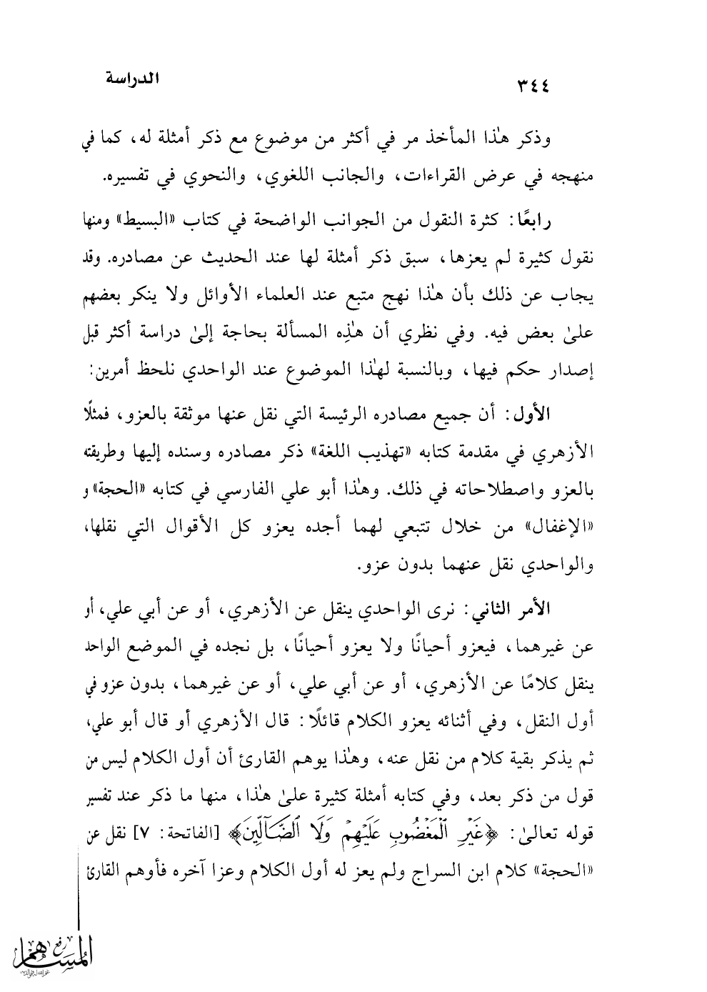 الأمر الثاني: نرى الواحدي ينقل عن الأزهري، أو عن أبي علي، أو عن غيرهما، فيعزو أحيانًا ولا يعزو أحيانًا، بل نجده في الموضع الواحد ينقل كلامًا عن الأزهري، أو عن أبي علي، أو عن غيرهما، بدون عزو في أول النقل، وفي أثنائه يعزو الكلام قائلًا: قال الأزهري أو قال أبو علي، ثم يذكر بقية كلام من نقل عنه، وهذا يوهم القارئ أن أول الكلام ليس من قول من ذكر بعد، وفي كتابه أمثلة كثيرة على هذا، منها ما ذكر عند تفسير قوله تعالى: {غَيْرِ الْمَغْضُوبِ عَلَيْهِمْ وَلَا الضَّالِّينَ} [الفاتحة: 7] نقل عن "الحجة" كلام ابن السراج ولم يعز له أول الكلام وعزا آخره فأوهم القارئ