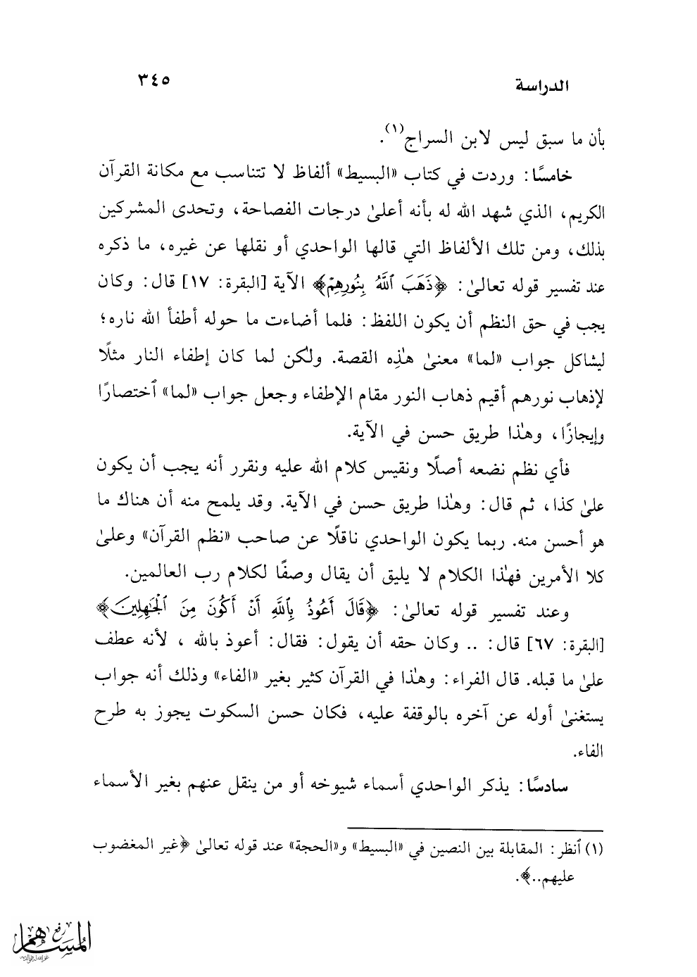 خامسًا: وردت في كتاب "البسيط" ألفاظ لا تتناسب مع مكانة القرآن الكريم، الذي شهد الله له بأنه أعلى درجات الفصاحة، وتحدى المشركين بذلك، ومن تلك الألفاظ التي قالها الواحدي أو نقلها عن غيره، ما ذكره عند تفسير قوله تعالى: {ذَهَبَ اللَّهُ بِنُورِهِمْ} الآية [البقرة: 17] قال: وكان يجب في حق النظم أن يكون اللفظ: فلما أضاءت ما حوله أطفأ الله ناره؛ ليشاكل جواب "لما" معنى هذه القصة. ولكن لما كان إطفاء النار مثلًا لإذهاب نورهم أقيم ذهاب النور مقام الإطفاء وجعل جواب "لما" اختصارًا وإيجازًا، وهذا طريق حسن في الآية.