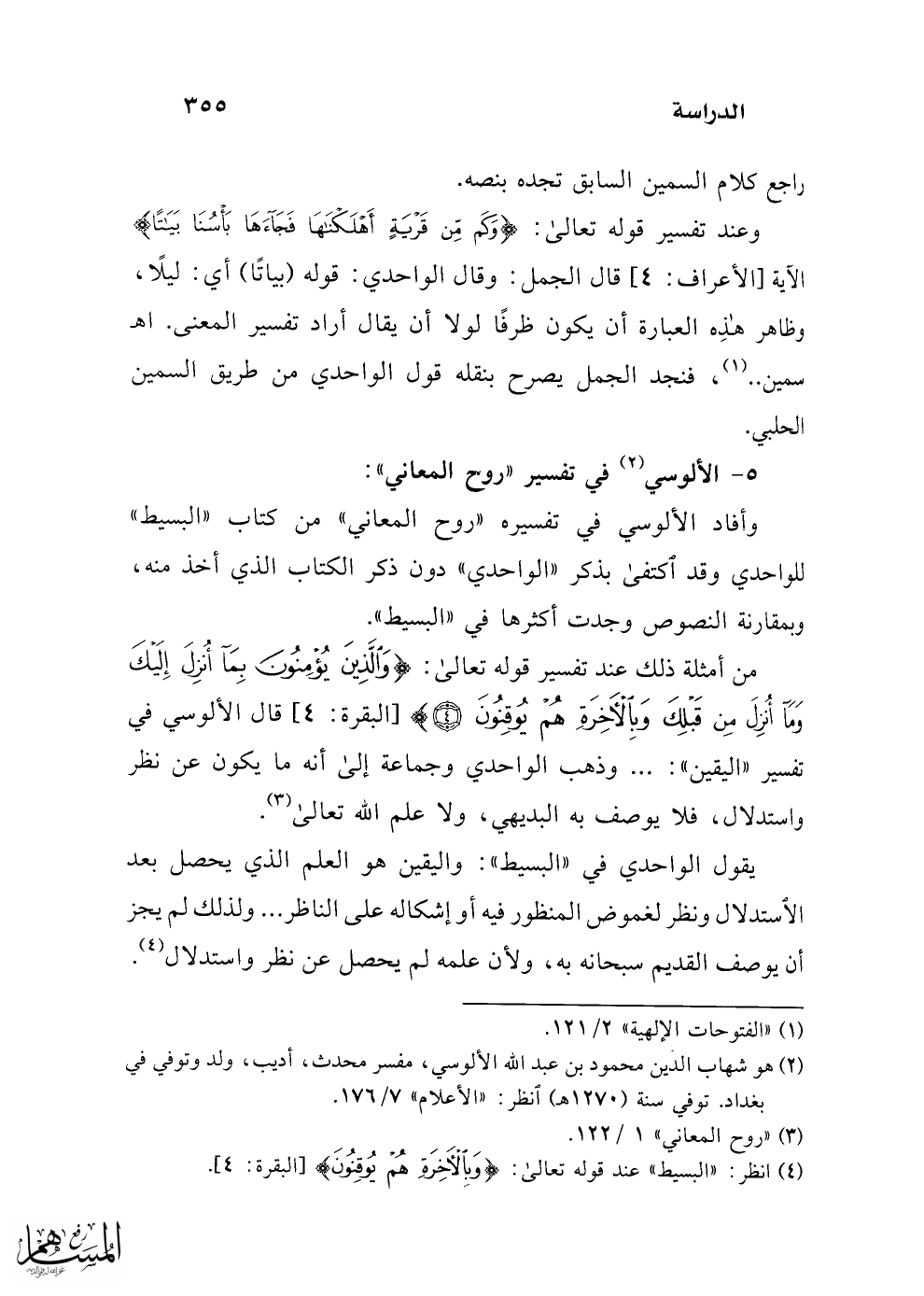 (¬4) انظر: "البسيط" عند قوله تعالى: {وَبِالْآخِرَةِ هُمْ يُوقِنُونَ} [البقرة: 4].