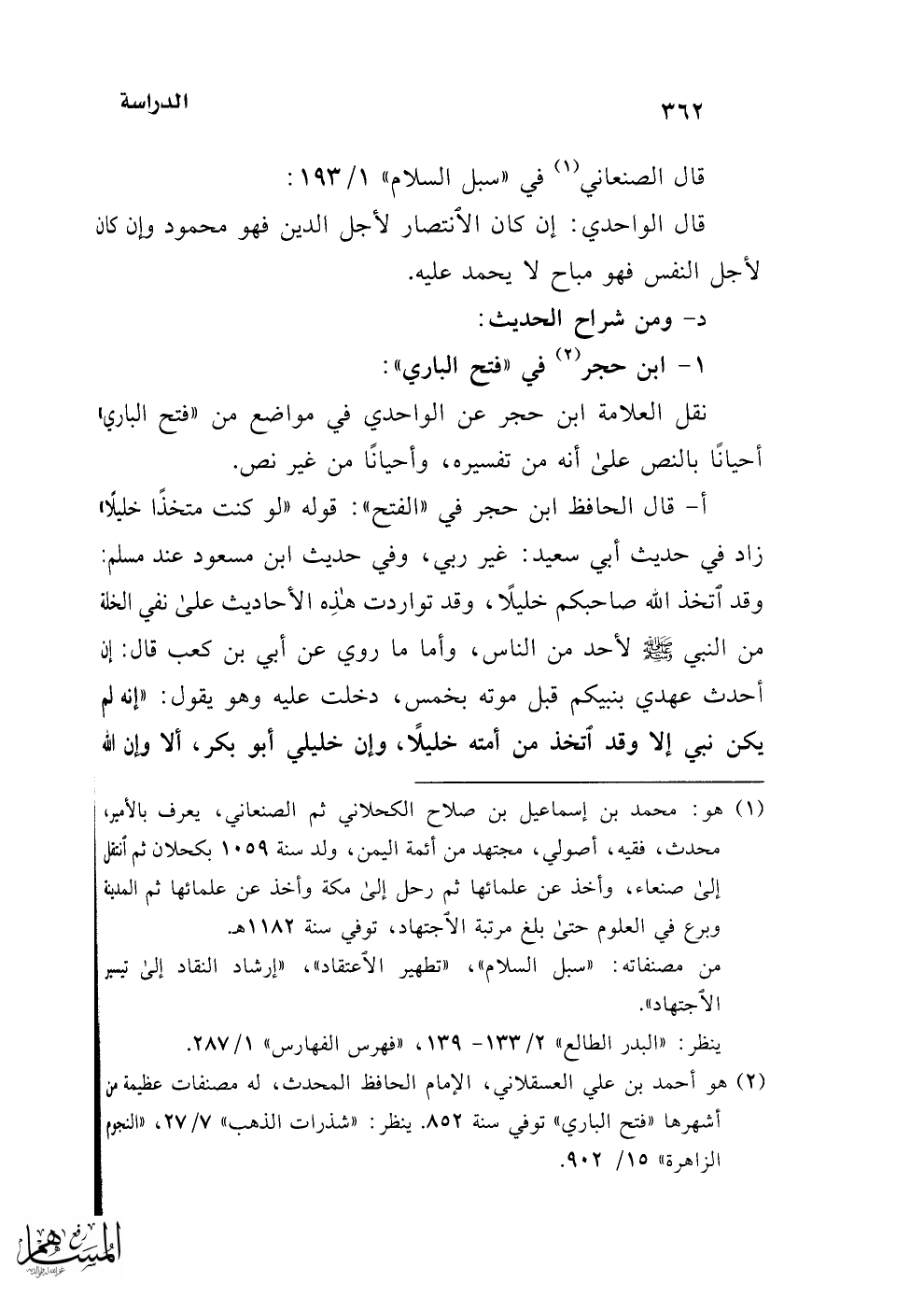 (¬1) هو: محمد بن إسماعيل بن صلاح الكحلاني ثم الصنعاني، يعرف بالأمير، محدث، فقيه، أصولي، مجتهد من أئمة اليمن، ولد سنة 1059 بكحلان ثم انتقل إلى صنعاء، وأخذ عن علمائها ثم رحل إلى مكة وأخذ عن علمائها ثم المدينة وبرع في العلوم حتى بلغ مرتبة الاجتهاد، توفي سنة 1182 هـ. من مصنفاته: "سبل السلام"، "تطهير الاعتقاد"، "إرشاد النقاد إلى تيسير الاجتهاد".