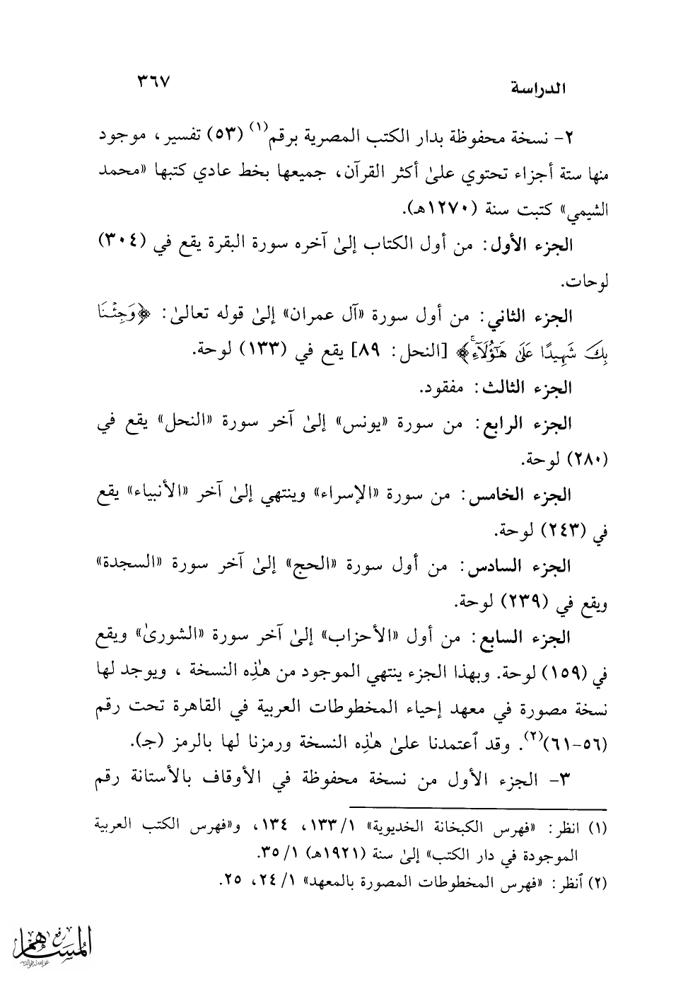(¬1) انظر: "فهرس الكبخانة الخديوية" 1/ 133، 134، و"فهرس الكتب العربية الموجودة في دار الكتب" إلى سنة (1921 هـ) 1/ 35.