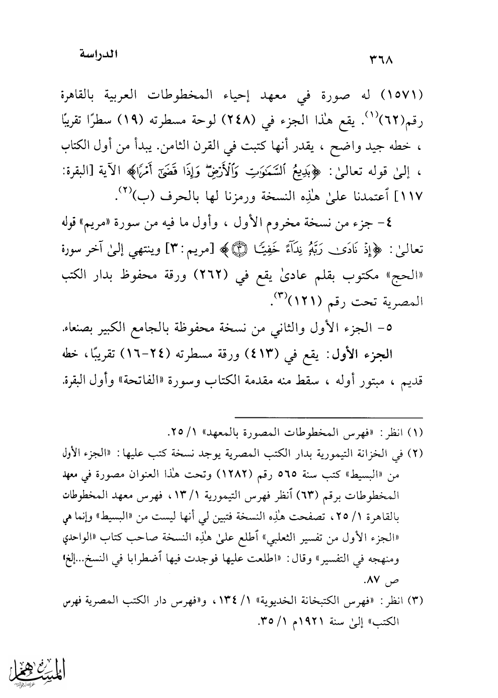 (1571) له صورة في معهد إحياء المخطوطات العربية بالقاهرة رقم (62) (¬1). يقع هذا الجزء في (248) لوحة مسطرته (19) سطرًا تقريبًا، خطه جيد واضح، يقدر أنها كتبت في القرن الثامن. يبدأ من أول الكتاب، إلى قوله تعالى: {بَدِيعُ السَّمَاوَاتِ وَالْأَرْضِ وَإِذَا قَضَى أَمْرًا} الآية [البقرة: 117] اعتمدنا على هذه النسخة ورمزنا لها بالحرف (ب) (¬2).