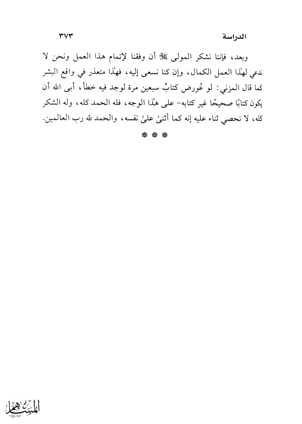 وبعد، فإننا نشكر المولى سبحانه وتعالى أن وفقنا لإتمام هذا العمل ونحن لا ندير لهذا العمل الكمال، وإن كنا نسعى إليه، فهذا متعذر في واقع البشر كما قال المزني: لو عُورض كتابٌ سبعين مرة لوجد فيه خطأ، أبى الله أن يكون كتابًا صحيحًا غير كتابه - على هذا الوجه، فله الحمد كله، وله الشكر كله، لا نحصي ثناء عليه إنه كما أثنى على نفسه، والحمد لله رب العالمين.