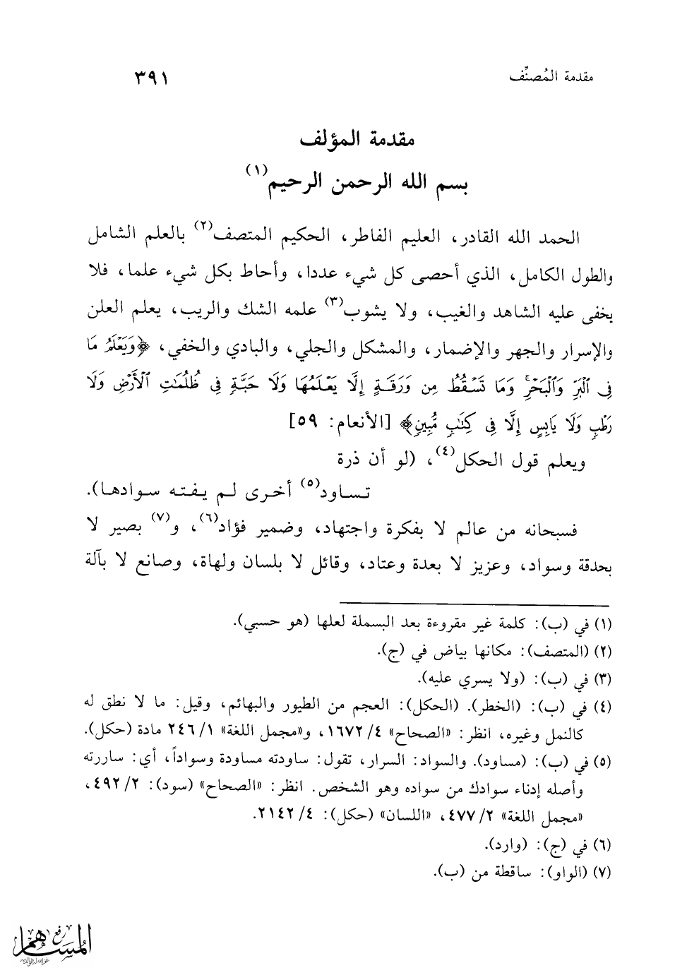 الحمد لله القادر، العليم الفاطر، الحكيم المتصف (¬2) بالعلم الشامل والطول الكامل، الذي أحصى كل شيء عددا، وأحاط بكل شيء علما، فلا يخفى عليه الشاهد والغيب، ولا يشوب (¬3) علمه الشك والريب، يعلم العلن والإسرار والجهر والإضمار، والمشكل والجلي، والبادي والخفي، {وَيَعْلَمُ مَا فِي الْبَرِّ وَالْبَحْرِ وَمَا تَسْقُطُ مِنْ وَرَقَةٍ إِلَّا يَعْلَمُهَا وَلَا حَبَّةٍ فِي ظُلُمَاتِ الْأَرْضِ وَلَا رَطْبٍ وَلَا يَابِسٍ إِلَّا فِي كِتَابٍ مُبِينٍ} [الأنعام: 59]