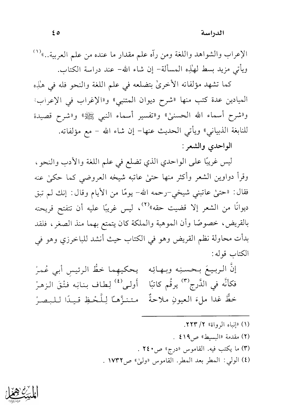 الإعراب والشواهد واللغة ومن رآه علم مقدار ما عنده من علم العربية .. " (¬1) ويأتي مزيد بسط لهذِه المسألة -إن شاء الله - عند دراسة الكتاب.
