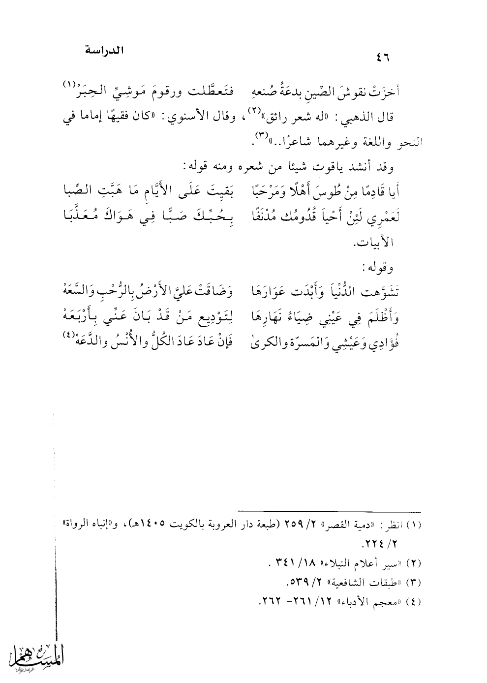 (¬1) انظر: "دمية القصر" 2/ 259 (طبعة دار العروبة بالكويت 1405 هـ)، و"إنباه الرواة" 2/ 224.