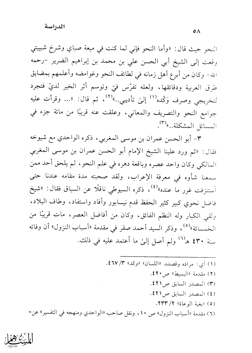 3 - أبو الحسن عمران بن موسى المغربي، ذكره الواحدي مع شيوخه فقال: "ثم ورد علينا الشيخ الإِمام أبو الحسن عمران بن موسى المغربي المالكي وكان واحد عصره وباقعة دهره في علم النحو، لم يلحق أحد ممن سمعنا شأوه في معرفة الإعراب، ولقد صحبته مدة مقامه عندنا حتى استنزفت غرر ما عنده" (¬4)، ذكره السيوطي ناقلاً عن السياق فقال: "شيخ فاضل نحوي كبير كثير الحفظ قدم نيسابور وأفاد واستفاد، وطاف البلاد، ولقي الكبار وله اتنظم الفائق، وكان من أفاضل العصر، مات قريباً من الخمسمائة" (¬5)، وذكر السيد أحمد صقر في مقدمة "أسباب النزول" أن وفاته سنة 430 هـ (¬6) ولم أصل إلى ما اعتمد عليه في ذلك.