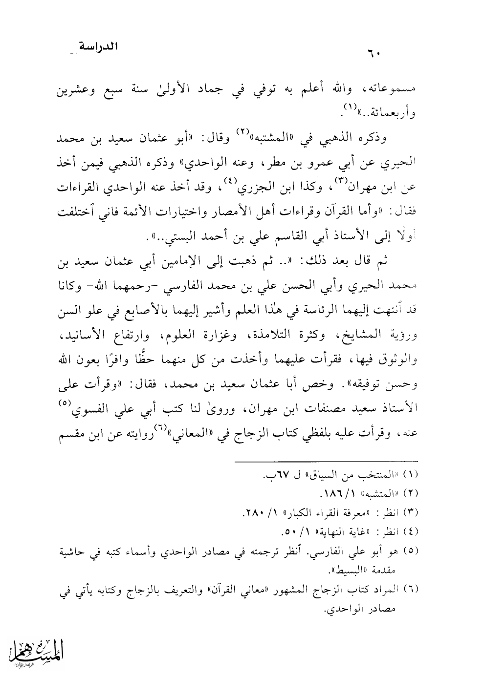 ثم قال بعد ذلك: " .. ثم ذهبت إلى الإمامين أبي عثمان سعيد بن محمد الحيري وأبي الحسن علي بن محمد الفارسي -رحمهما الله- وكانا قد انتهت إليهما الرئاسة في هذا العلم وأشير إليهما بالأصابع في علو السن ورؤية المشايخ، وكثرة التلامذة، وغزارة العلوم، وارتفاع الأسانيد، والوثوق فيها، فقرأت عليهما وأخذت من كل منهما حظّاً وافراً بعون الله وحسن توفيقه". وخص أبا عثمان سعيد بن محمد، فقال: "وقرأت على الأستاذ سعيد مصنفات ابن مهران، وروى لنا كتب أبي علي الفسوي (¬5) عنه، وقرأت عليه بلفظي كتاب الزجاج في "المعاني" (¬6) روايته عن ابن مقسم