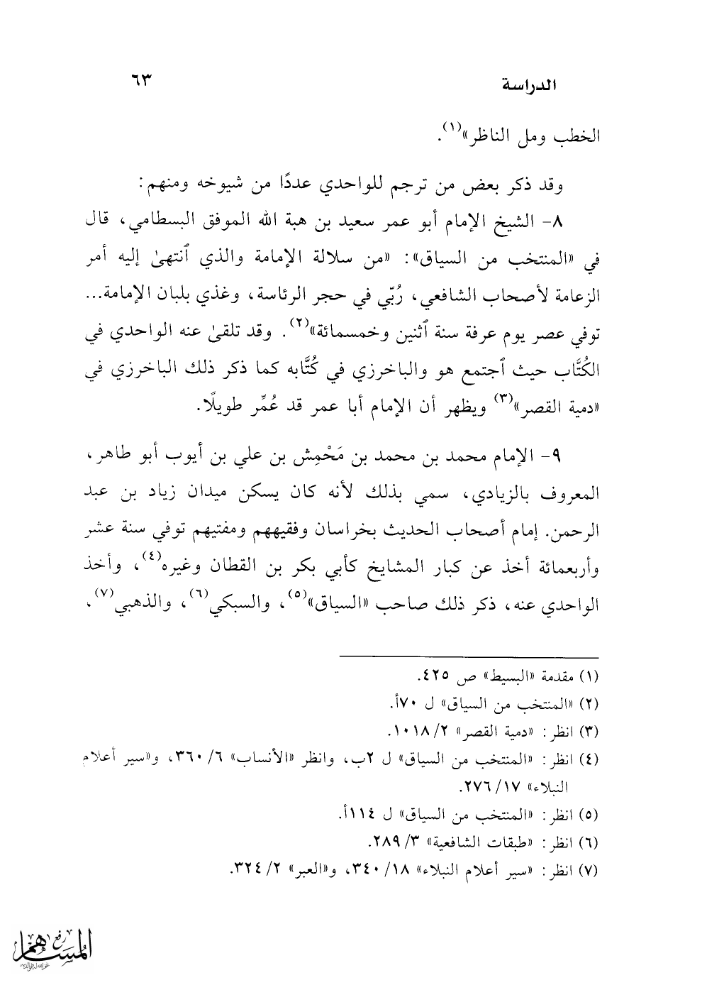8 - الشيخ الإِمام أبو عمر سعيد بن هبة الله الموفق البسطامي، قال في "المنتخب من السياق": "من سلالة الإمامة والذي انتهى إليه أمر الزعامة لأصحاب الشافعي، رُبّي في حجر الرئاسة، وغذي بلبان الإمامة ... توفي عصر يوم عرفة سنة اثنين وخمسمائة" (¬2). وقد تلقى عنه الواحدي في الكُتَّاب حيث اجتمع هو والباخرزي في كُتَّابه كما ذكر ذلك الباخرزي في "دمية القصر" (¬3) ويظهر أن الإِمام أبا عمر قد عُمِّر طويلاً.