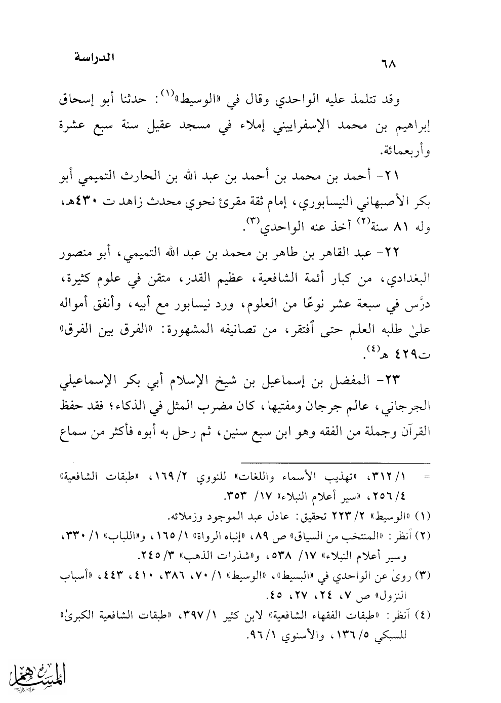 21 - أحمد بن محمد بن أحمد بن عبد الله بن الحارث التميمي أبو بكر الأصبهاني النيسابوري، إمام ثقة مقرئ نحوي محدث زاهد ت 430 هـ، وله 81 سنة (¬2) أخذ عنه الواحدي (¬3).