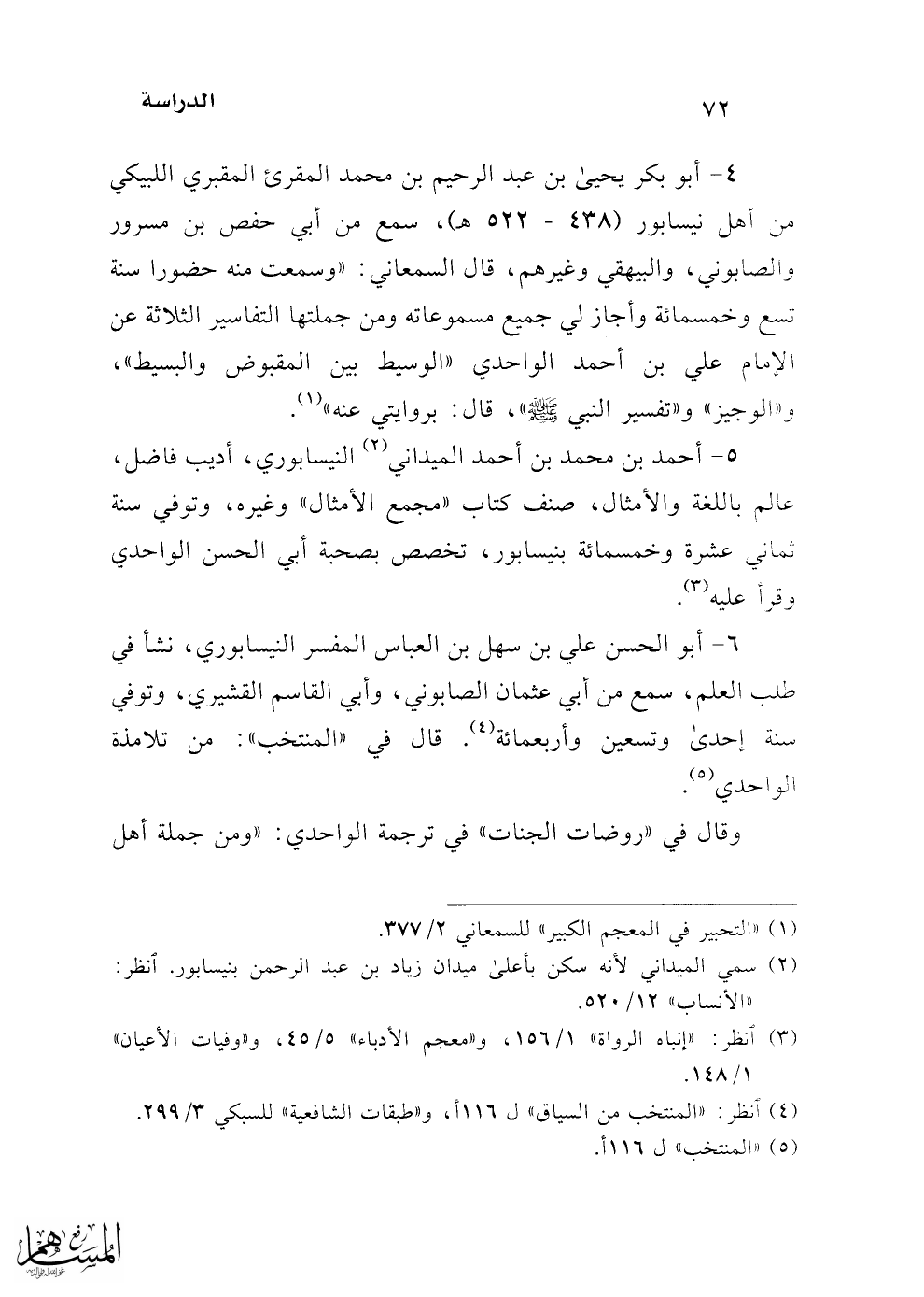 5 - أحمد بن محمد بن أحمد الميداني (¬2) النيسابوري، أديب فاضل، عالم باللغة والأمثال، صنف كتاب "مجمع الأمثال" وغيره، وتوفي سنة ثماني عشرة وخمسمائة بنيسابور، تخصص بصحبة أبي الحسن الواحدي وقرأ عليه (¬3).