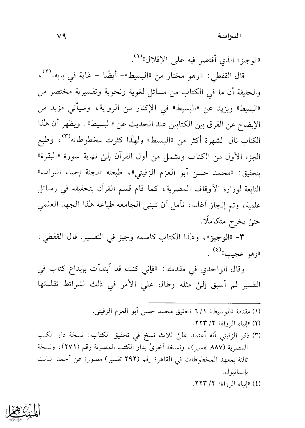 قال القفطي: "وهو مختار من "البسيط" -أيضًا- غاية في بابه" (¬2)، والحقيقة أن ما في الكتاب من مسائل لغوية ونحوية وتفسيرية مختصر من "البسيط" ويزيد عن "البسيط" في الإكثار من الرواية، وسيأتي مزيد من الإيضاح عن الفرق بين الكتابين عند الحديث عن "البسيط". ويظهر أن هذا الكتاب نال الشهرة أكثر من "البسيط" ولهذا كثرت مخطوطاته (¬3)، وطبع الجزء الأول من الكتاب ويشمل من أول القرآن إلى نهاية سورة "البقرة" بتحقيق: "محمد حسن أبو العزم الزفيتي"، طبعته "لجنة إحياء التراث" التابعة لوزارة الأوقاف المصرية، كما قام قسم القرآن بتحقيقه في رسائل علمية، وتم إنجاز أغلبه، نأمل أن تتبنى الجامعة طباعة هذا الجهد العلمي حتى يخرج متكاملاً.