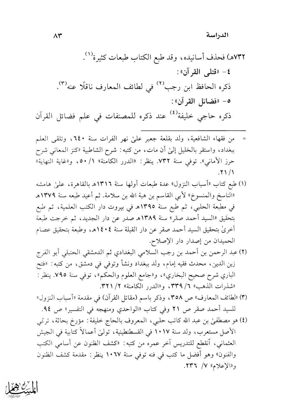 ذكره حاجي خليفة (¬4) عند ذكره للمصنفات في علم فضائل القرآن