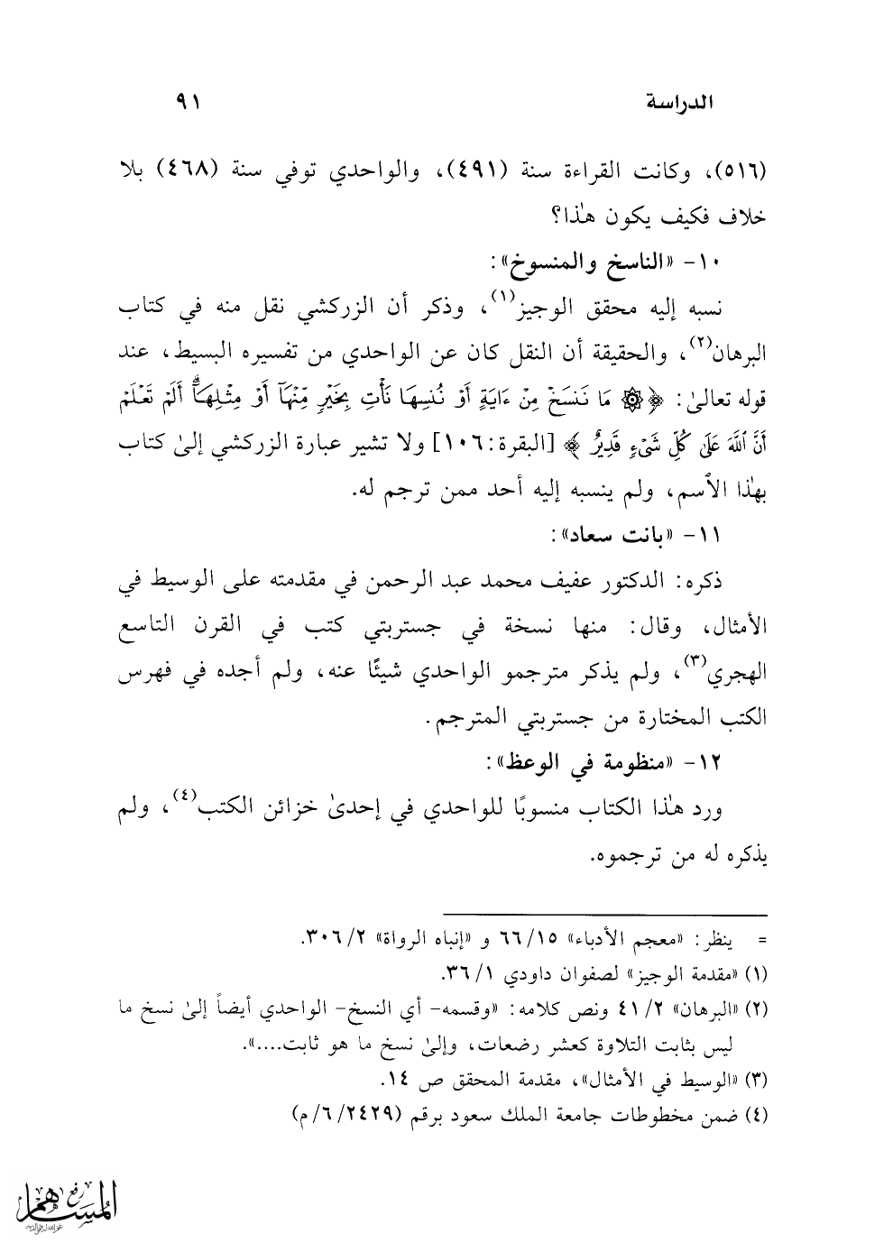 (516)، وكانت القراءة سنة (491)، والواحدي توفي سنة (468) بلا خلاف فكيف يكون هذا؟