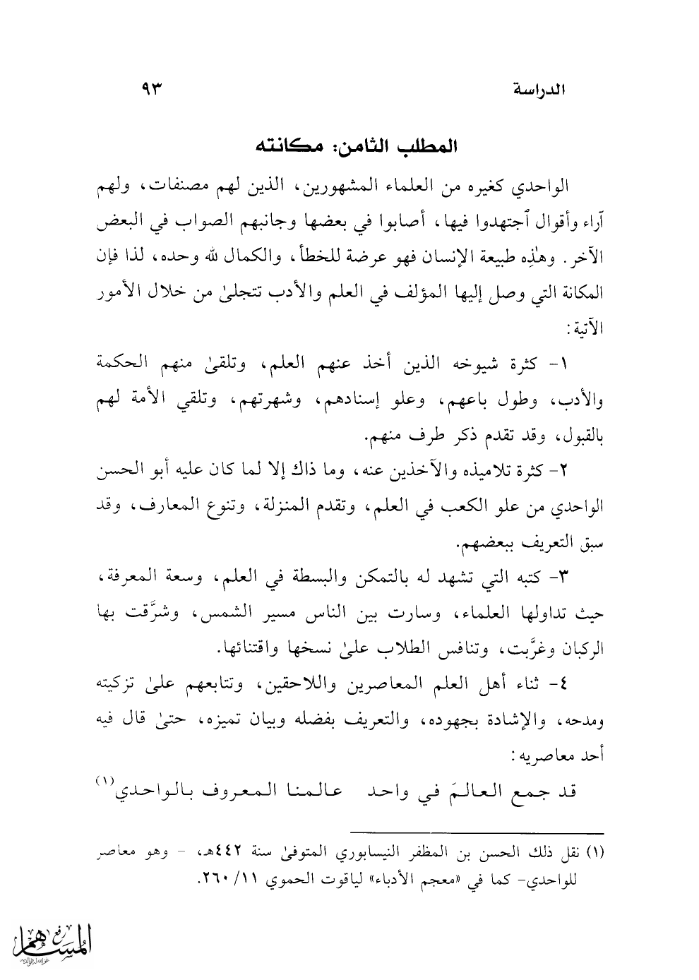 (¬1) نقل ذلك الحسن بن المظفر النيسابوري المتوفى سنة 442 هـ، -وهو معاصر للواحدي- كما في "معجم الأدباء" لياقوت الحموي 11/ 260.